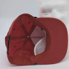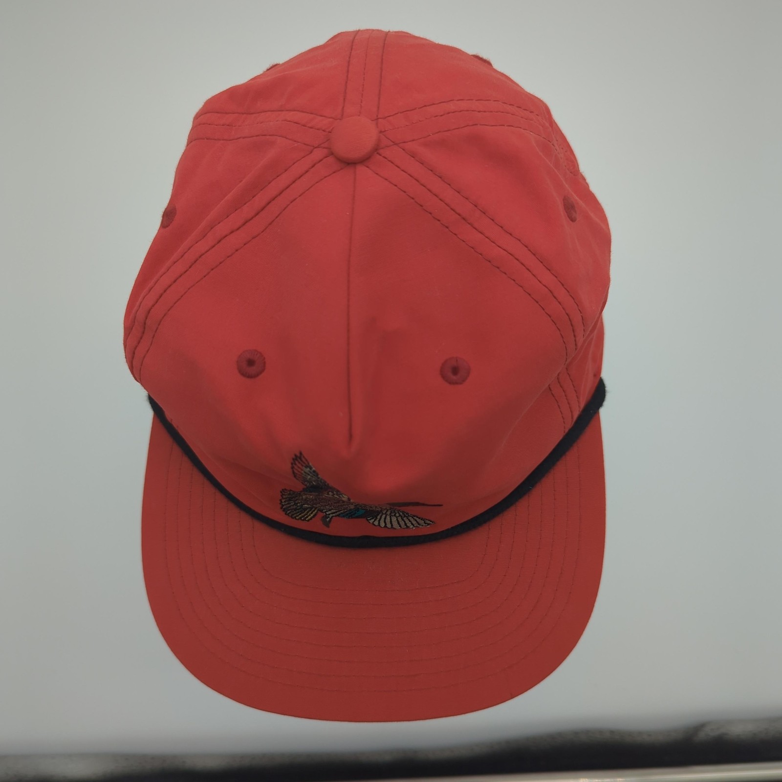 Brand: Unbranded Style: Hat Cap Snap Back with flat brim and rope detail across the front of the crown. Color: Red cap with black rope trim and multicolor flying mallard duck embroidery on the front panel. Closure: Adjustable plastic snap back; designed to fit most adult head sizes (Mens). Interior: Unstructured crown with light mesh lining at the front panel and stitched eyelets for ventilation. Great for hunting, outdoor activities, or casual everyday wear for duck and waterfowl enthusiasts.