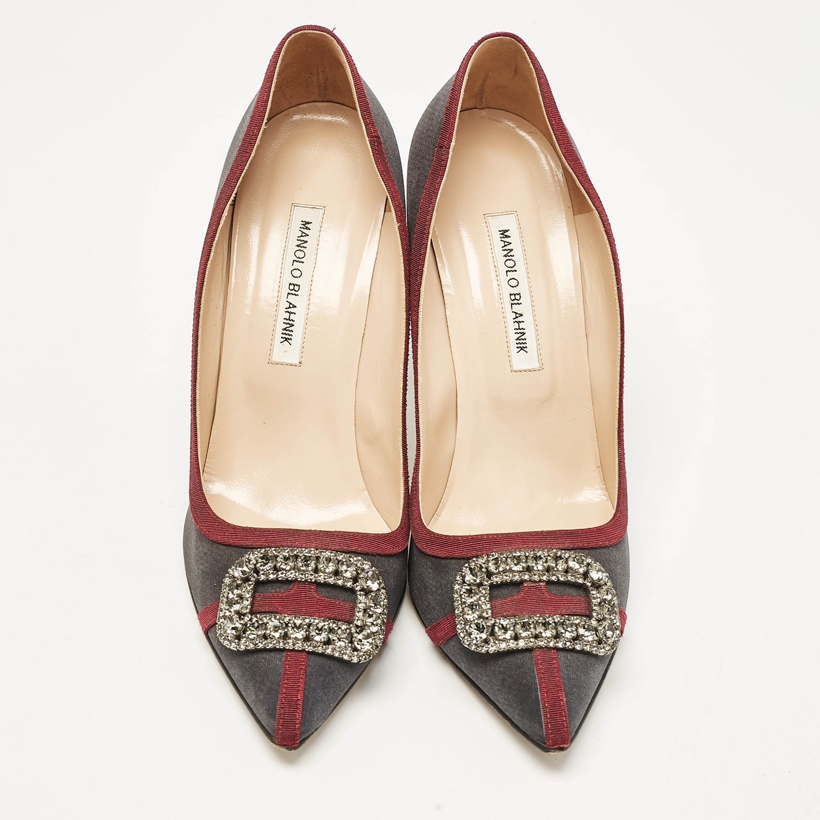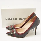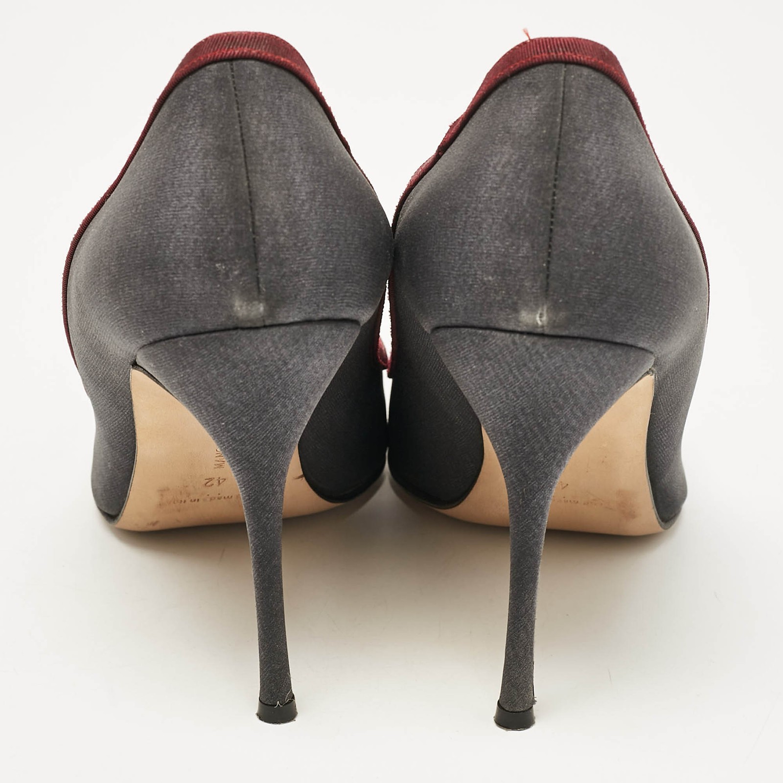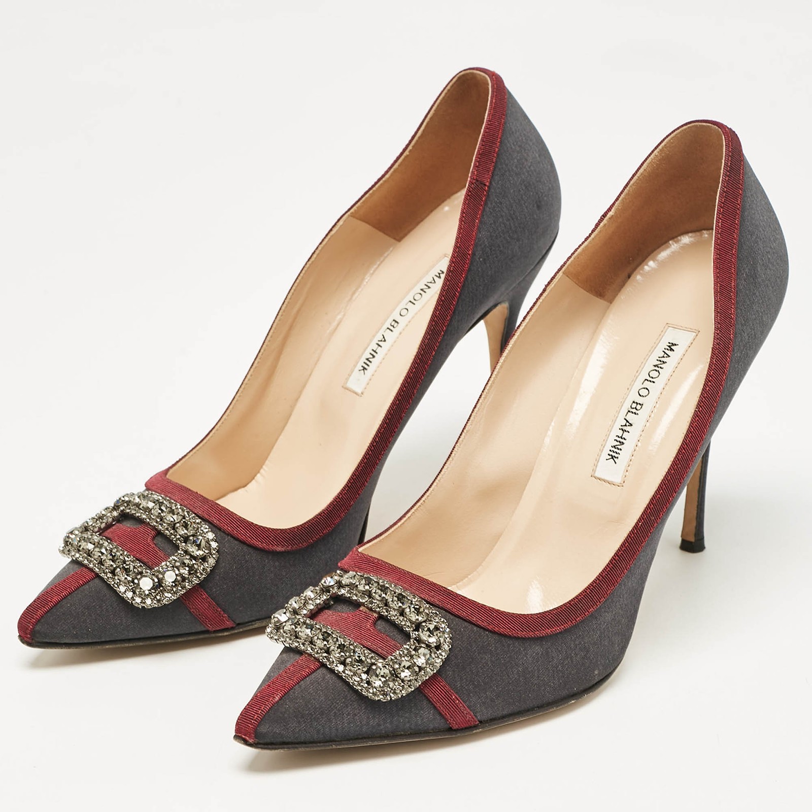 Make a chic style statement with these designer pumps. They showcase sturdy heels and durable soles, perfect for your fashionable outingsCertified by The Luxury Closet - This item has gone through a detailed authentication process overseen by our experts. We offer a lifetime guarantee of authenticity on all our items. Import duties, taxes and charges are not included in the item price. These charges are the buyers responsibility. Please check with your country’s customs office to determine what these additional cost will be prior to buying. Our eBay Store About Us Contact Us Add to Favorite Sellers Manolo Blahnik Grey/Burgundy Satin Crystal Gotrian Pumps Size 42 $155.1 Make a chic style statement with these designer pumps. They showcase sturdy heels and durable soles, perfect for your fashionable outings Product Details Brand Color Grey Dimensions Material Satin Size 42 Outsole Width 8.5 cm Outsole Length 25 cm Heel Height 11 cm Includes Original Box Certified by The Luxury Closet This item has gone through a detailed authentication process overseen by our experts. We offer a lifetime guarantee of authenticity on all our items. How We Check The in-house team of experts at The Luxury Closet is highly trained to verify the authenticity and the condition of the luxury products. They ensure that only 100% authentic items are put on sale.The evaluation process is unique with its own mix of assessment criteria and differs according to the category. Each item is evaluated based on the following combination of hallmarks, hardware, stitching, symmetry, material, craftsmanship, stamping, codes, hologram stickers, and packaging. Our authenticators also check if the items have been modified or amended (e.g., aftermarket diamonds, replaced batteries, repaired bags, etc.) International Buyers Import duties, taxes and charges are not included in the item price. These charges are the buyers responsibility. Please check with your country’s customs office to determine what these additional cost will be prior to buying.