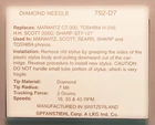 NEW IN BOX PFANSTIEHL 792-D7 DIAMOND REPLACEMENT NEEDLE FOR MARANTZ, TOSHIBA, H.H. SCOTT, SHARP SEARS AND OTHER TURNTABLES. REPLACES THE FOLLOWING NEEDLES: Marantz CT-300 Sharp Sty-127 Scott 20SC Toshiba N-292 .7 MIL DIAMOND PLAYS 33 AND 45 RPM RECORDS 2 GRAMS FORCE Search my store for your needle, cartridge or other turntable accessories. Email me for help. Delivery confirmation in the United States is included in the shipping price. The confirmation number will be sent to the buyer when the item/items ship, usually within 24 hours. Check out my other items ! FREE SHIPPING IN THE USA. TERMS OF SALE: By Using "Buy it now" or bidding on an auction item the buyer or bidder agrees to the following terms; The item descriptions or item titles may or MAY NOT be correct in regards to which needle fits a cartridge or fits a particular model turntable. If the original cartridge has been replaced by the owner with a different manufacturer’s cartridge this needle or cartridge won’t fit. Match your old needle to the picture of the needle within this item description. IF YOU DON'T HAVE AN OLD NEEDLE TO COMPARE TO THE PICTURE IN THE ITEM DESCRIPTION DO NOT MAKE A PURCHASE. Many needles were manufactured in a variety of colors so disregard color when making your comparisons. If you don’t have the old needle then lower the cartridge from the tonearm (leave the wiring attached) and take the number that is located on the top and simply match it to the numbers within the list of compatible cartridges above. Hit the contact seller button to email me for help if you need it. SHIPPING; items ship to the shipping address in the buyers paypal account. NO EXCEPTIONS. CHECK THE SHIPPING ADDRESS IN YOUR PAYPAL ACCOUNT FOR ACCURACY BEFORE MAKING A PURCHASE. All items ship USPS first class mail unless otherwise specified in the item descriptions. USPS first class mail is usually delivered within 3 to 5 days. Ebay's estimated shipping times are an EBAY estimate. USPS Delays occur and buyers are urged to be patient. Delivery confirmation is provided and will be emailed to the buyer when the postage label is generated. Items purchased Monday through Saturday before 8am EST ship same day. Items purchased after 8am EST ship the following morning. Items purchased after 8am Saturday and Sunday ship 9am Monday morning. RETURN SHIPPING Return shipping costs for any return regardless of the reason for the return is to be paid by the buyer. NO EXCEPTIONS. PRICING AND DISCOUNTS: There are no discounts for multiple purchases. Prices are firm. Email requests for discounts are deleted without a reply. If you have any questions at all please contact me so We can determine the correct needle or cartridge for your model.