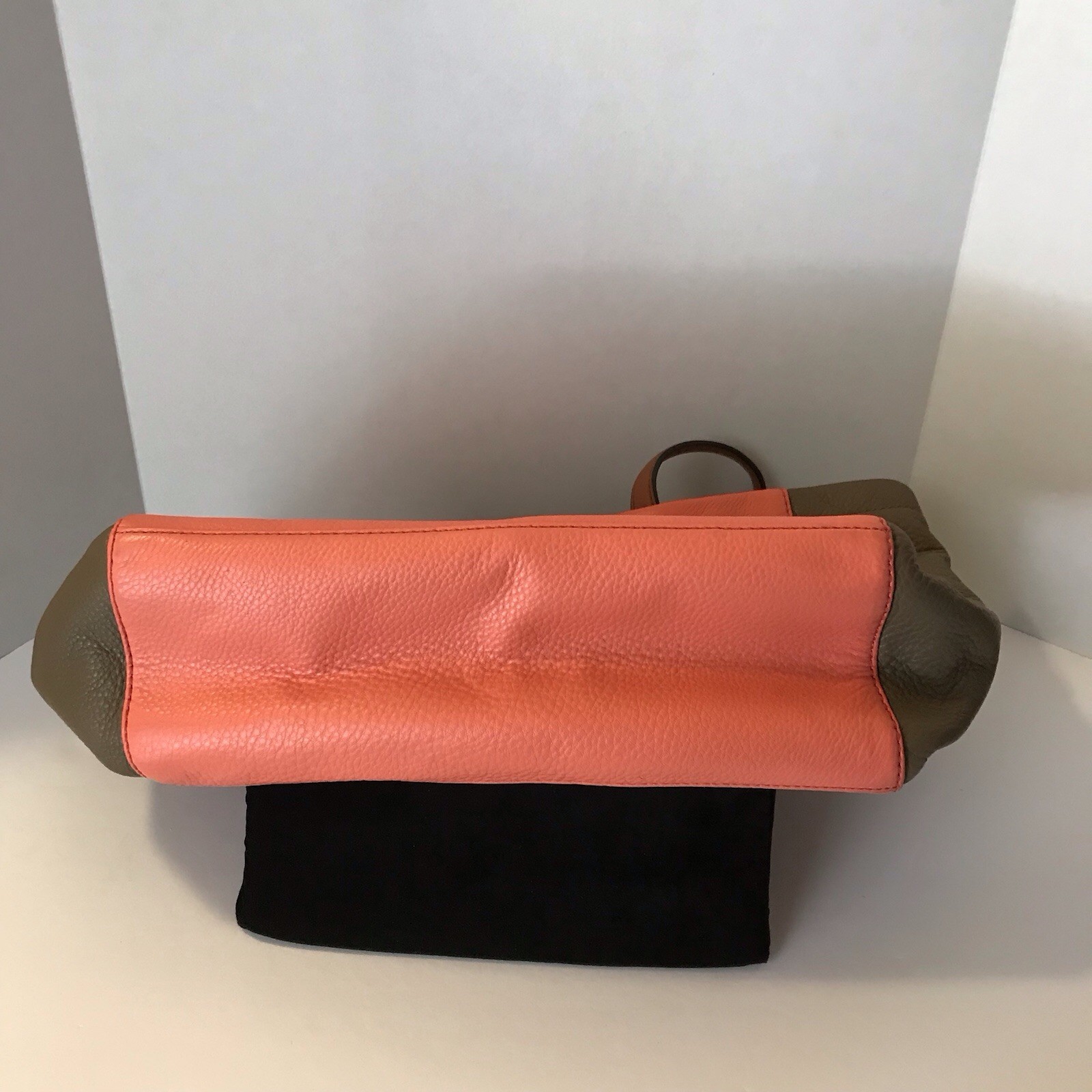 The Marc By Marc Jacobs Pebble Leather Tote Bag Purse is a medium-sized tote with a stylish color block design in orange and brown. Made from pebbled leather, this bag features double brown leather handles and a magnetic closure. The interior is lined with fabric in a matching brown color, and it includes gold hardware. Brand new never used with Marc Jacob’s dust bag. Perfect for travel, casual outings, or business meetings, this tote exudes a designer flair and sophistication. Ideal for women who appreciate quality craftsmanship and timeless style. Feel free to message with any questions. Will be mailed quickly and packaged professionally for your needs.
