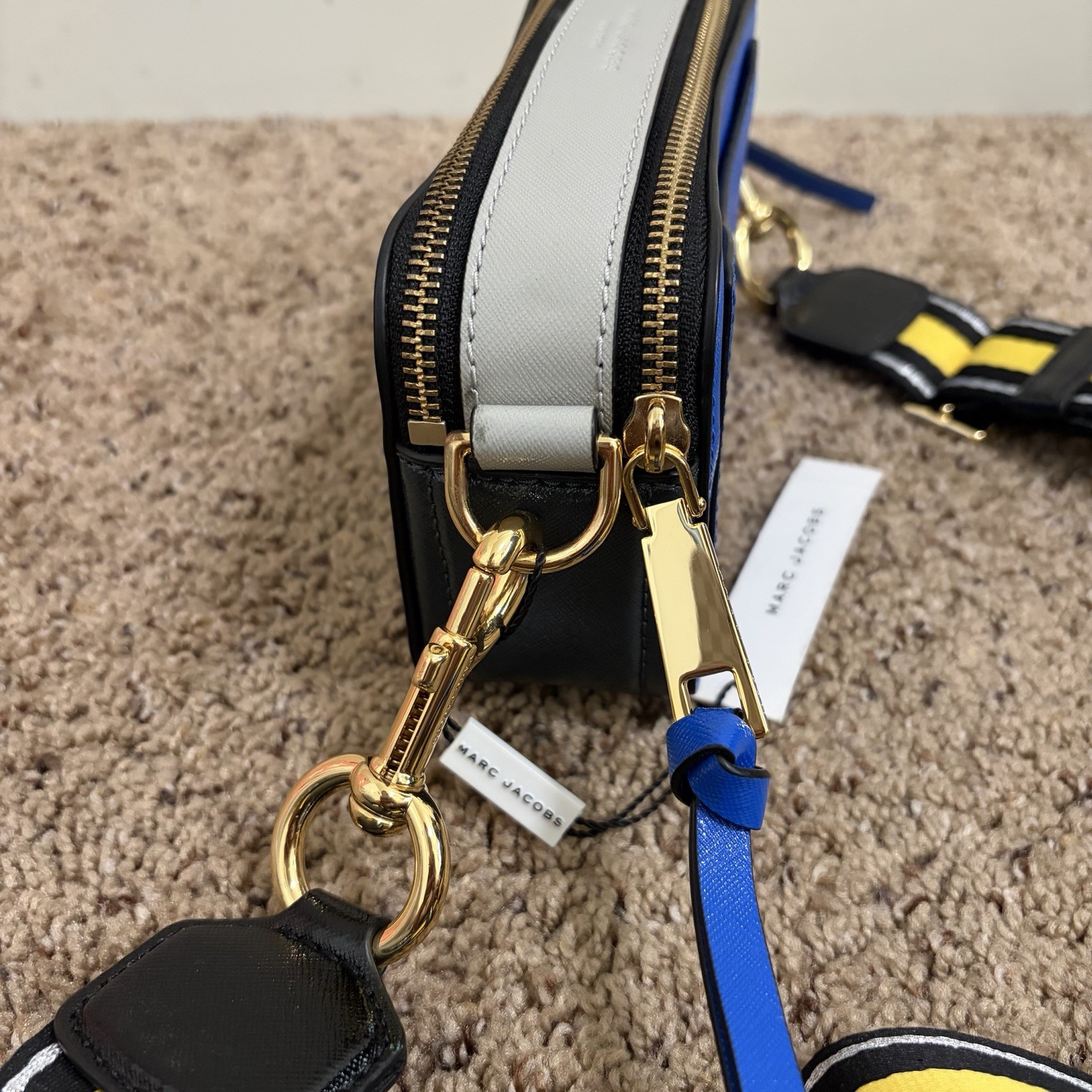 Marc Jacobs NWT The Snapshot Bag Dazzling Blue Multi Yellow Strap New with Tags!!! Does come with extra black strap. Does NOT come with dustbag. Details: Functional Compartments: Features a dual top zip closure with a double zip compartment, providing ample space for your essentials. • Adjustable Strap: Comes with a removable and adjustable webbing strap, allowing for versatile carrying options. • Convenient Pockets: Includes an interior slip pocket and an exterior slip pocket for easy access to small items. • Compact Dimensions (approx. measurements, see pics): Measures 7in L x 2.25in D x 4.25 in H, making it a perfect size for everyday use.