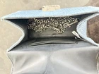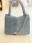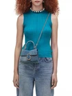 Top handles, 3.7" drop Removable chain crossbody strap Dimensions: 7.3"W x 3.5"D x 5.5"H Flap with magnetic closure & logo hardware Two interior card slots Denim design with all-over crystal embellishment Lined Main: 100% cotton; lining: 70% polyurethane/30% cotton Imported