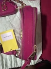 This is a Marc Jacobs The Snapshot DTM camera bag in saffiano leather with a tonal logo webbing strap.