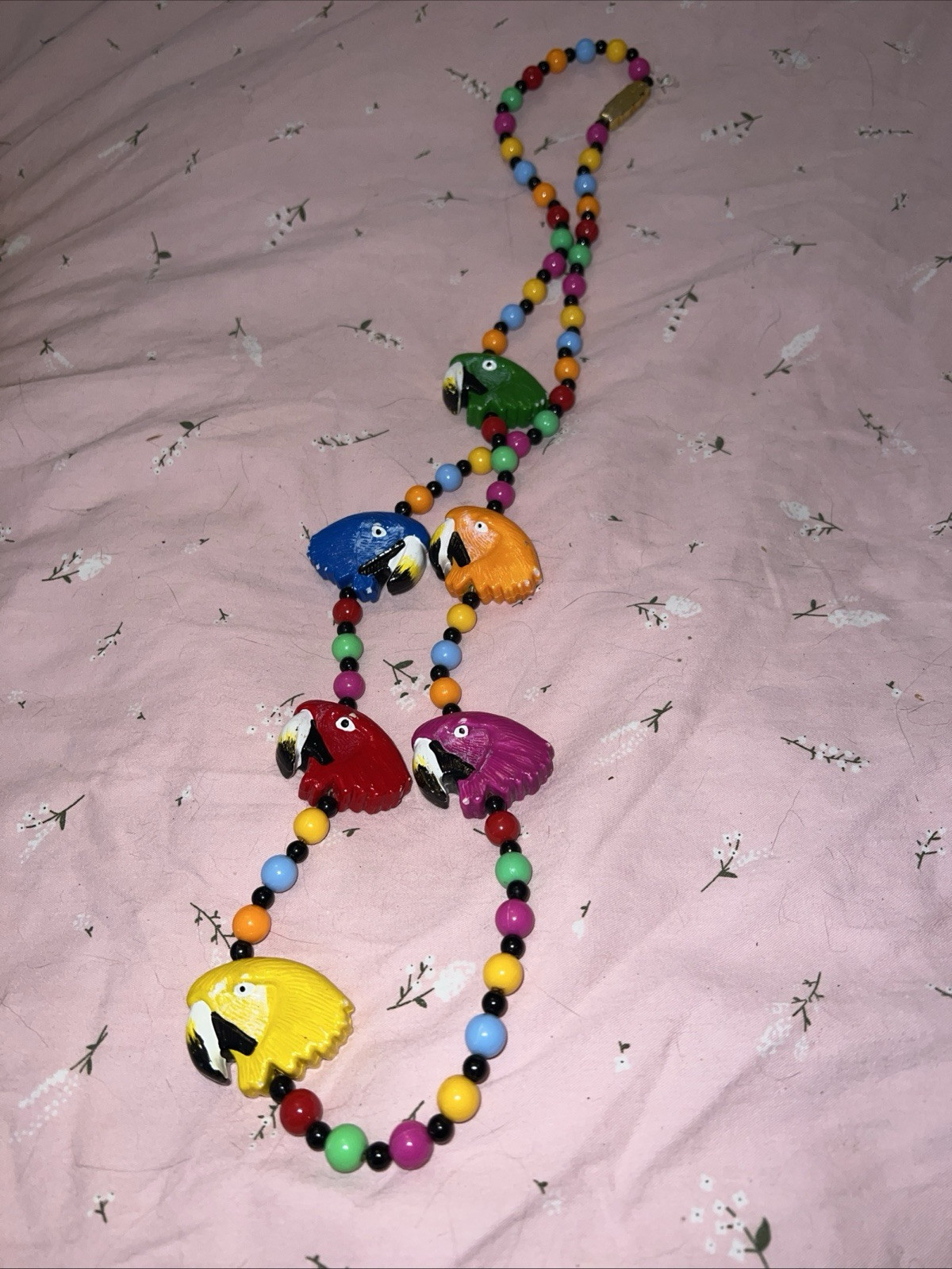 Add a touch of vibrancy to your costume with this Mardi Gras Bead Necklace. The necklace features bright, multicolor beads with parrot designs on them, giving it a unique and festive look. Made of plastic, this beaded necklace is perfect for those who want to add a colorful accessory to their outfit without worrying about the weight of real beads. The necklace is perfect for parties, carnivals, or any occasion where you want to stand out from the crowd.