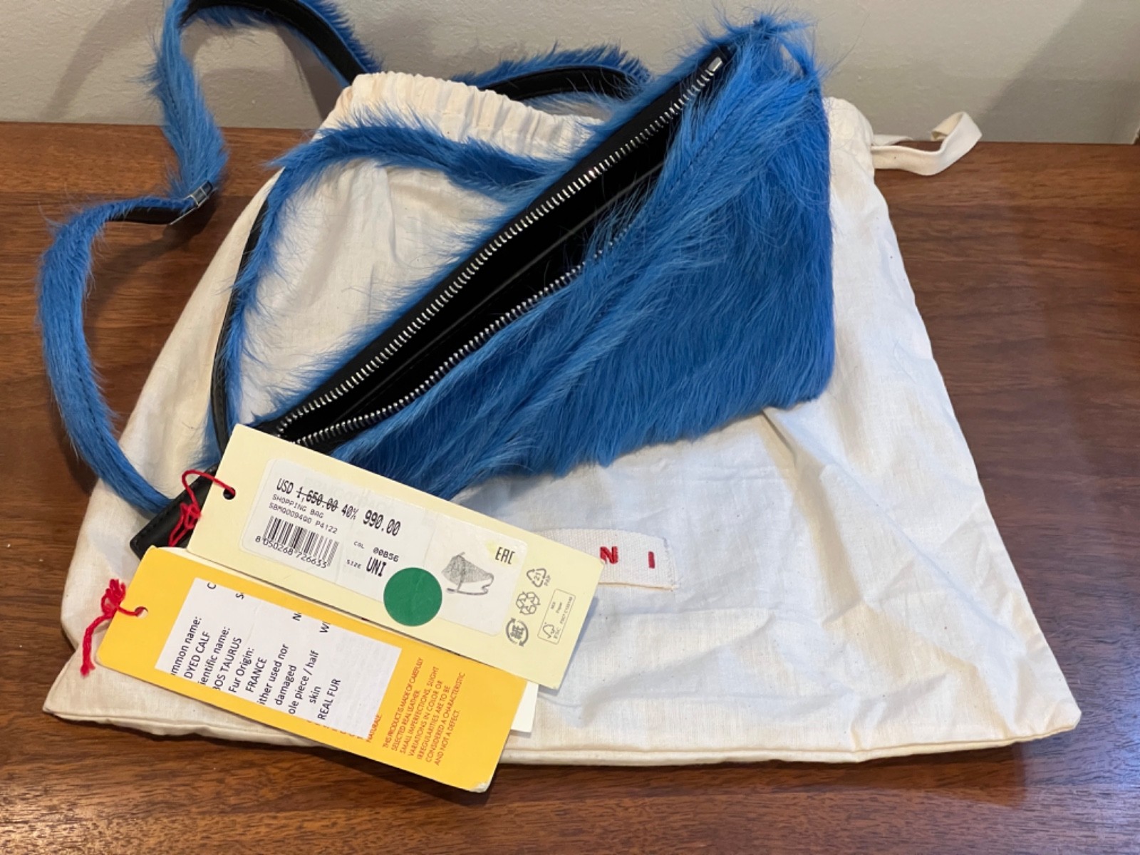 Brand new retails for $990. Pony hair messenger bag in blue. · Logo hardware at fixed shoulder strap · Zip closure · Two-compartment interior · Buffed calfskin lining · H5.5" x W8" x D4" Supplier color: Royal Made in Italy.