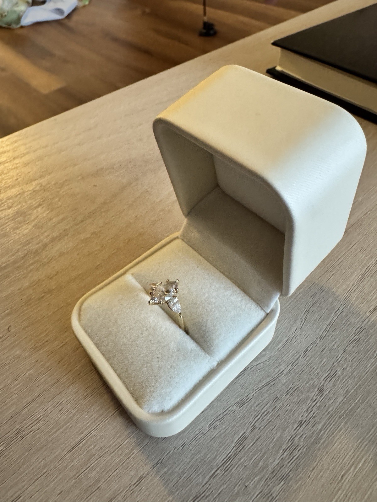 The ring and diamond are still in perfect condition. It’s was bought in May and only for 3 month. Feel free to contact me with any questions. Marquise diamond ring , Excellent , H,VS1 1.30ct diamond 0.25ct diamonds on side 18k yellow gold Size 4 See diamond certificate in pictures