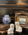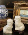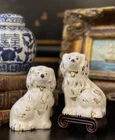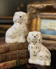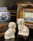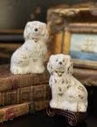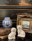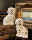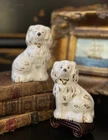 Stunning Rare Petite English Beswick Staffordshire Porcelain Mantle Dog Pair • Height 3.5” This rare pair of darling miniature right and left facing white English Staffordshire spaniel mantle dogs in classic form will bring a touch of the English countryside to any setting in which they are placed. Perfect paired on their own or as part of a collection or arrangement. Condition excellent. Wonderful surviving examples to treasure. * Listing is for pair of dogs only. Other items for display purposes. Height 3.5”