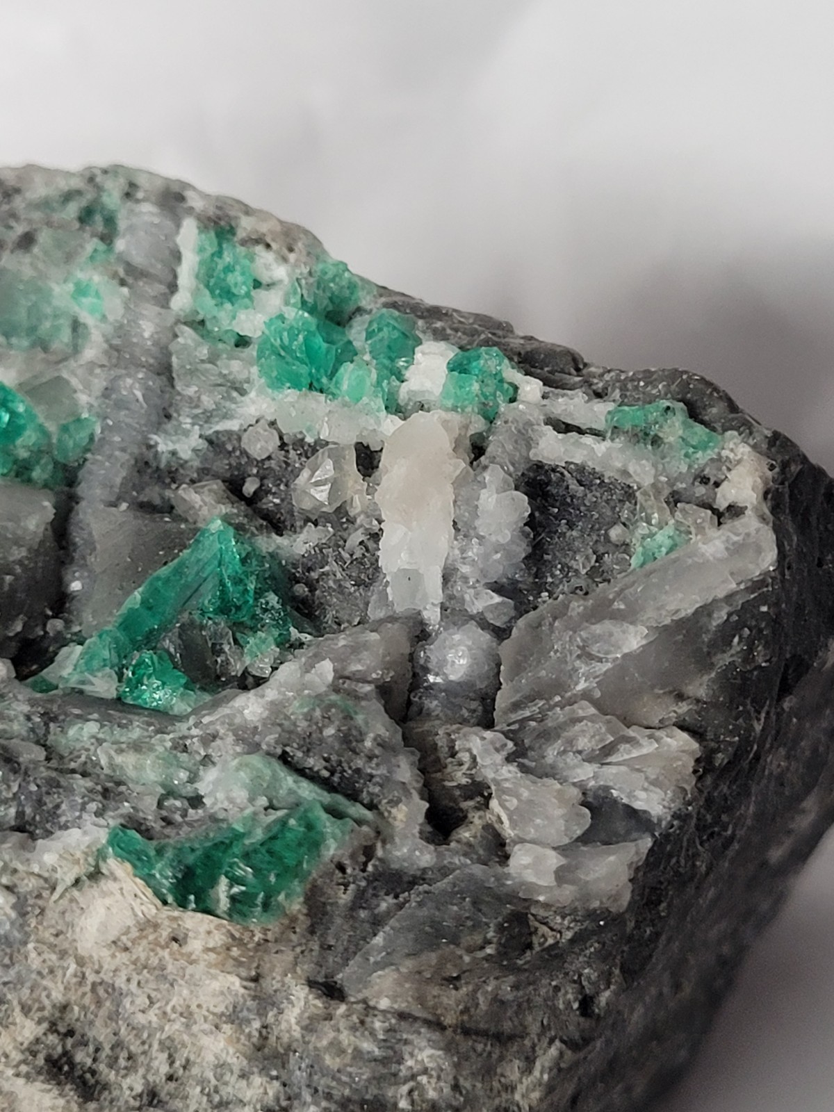 Beautiful Columbian Emerald on Pyrite Matrix. Weighs 1 lb 4 oz. Measures 4.25" long x 3" wide x 2.25" tall. Absolutely beautiful high quality specimen. The pyrite glistens on the base. One piece available.