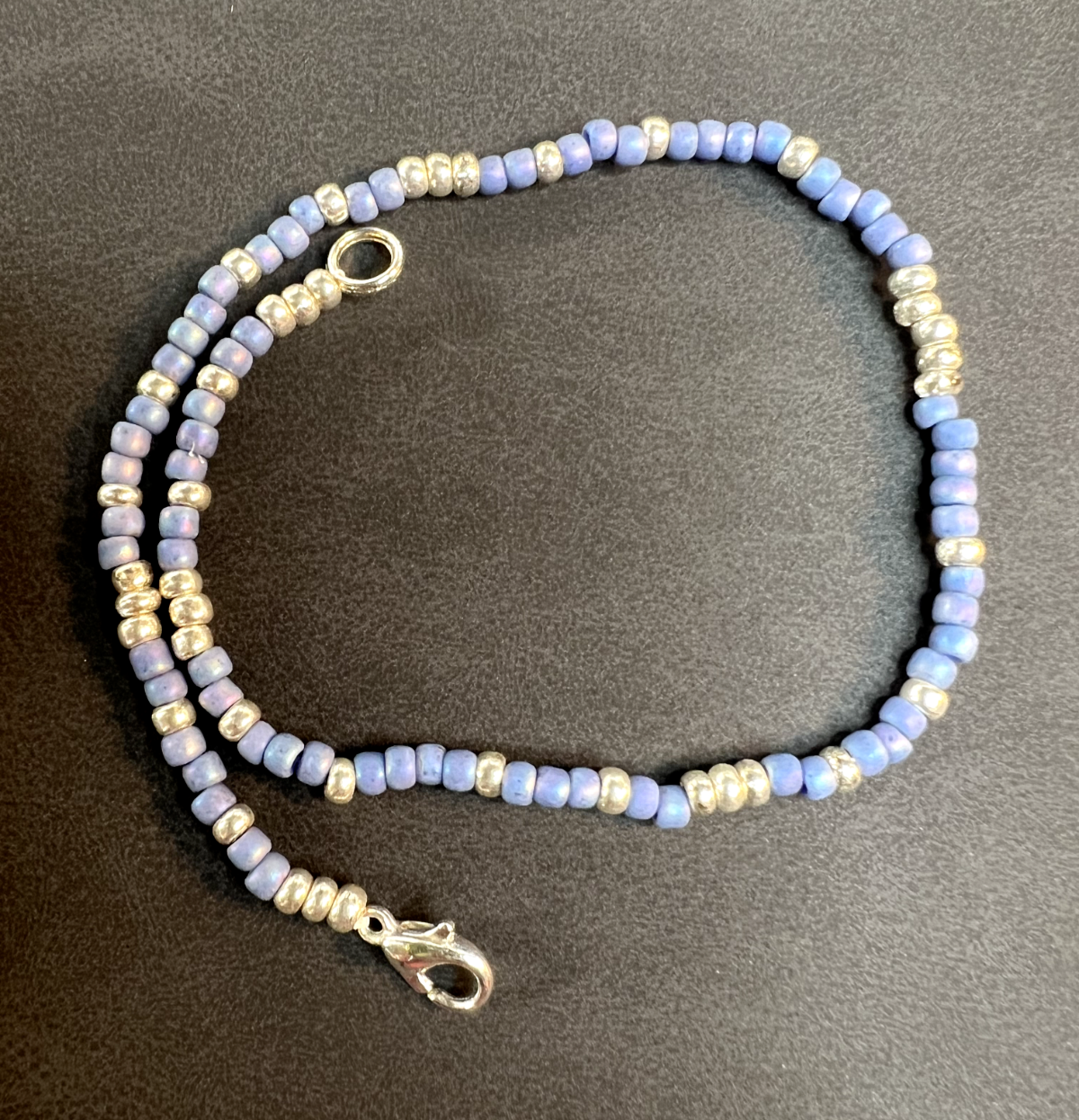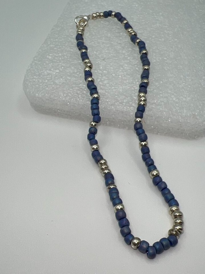 ANKLET - blue delicate glass beaded anklet w/silver plated lobster claw clasp Bracelet measures approximately 10" in length.