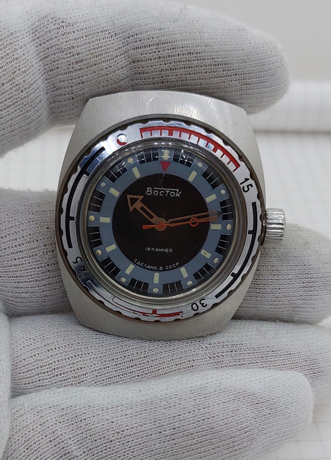 This is a vintage men's wristwatch from the 1980s by Vostok, known as the Komandirskie model. It features a tonneau/barrel watch shape with a silver stainless steel case, bidirectional rotating bezel, and a blue and multicolor logo dial pattern. The watch has 18 jewels, a mechanical manual movement, and is water-resistant up to 200 meters. With a screwback case, screwdown crown, and acrylic crystal, this classic and military-style timepiece is splash-proof and suitable for casual wear. This Vostok Commander Amphibian watch comes in a 43mm case size with a chrome finish, making it a unique and stylish accessory for watch enthusiasts. We boldly create a market where the customer will never suffer losses, if you are unhappy with the product or it was damaged during transportation, we will definitely refund your money or send a replacement as you wish! Combined shipping is possible, please contact us and we are always happy to help! Delivery is carried out only by air, and we take full responsibility for its safe delivery! We will provide a tracking number and ship your order within three business days! Happy shopping and we look forward to visiting our store again. Do not make rash bids, ask questions about the item and we will be happy to answer them. WE APPRECIATE YOUR SUPPORT IN SUCH A DIFFICULT TIME FOR OUR COUNTRY, ON BEHALF OF ME ALL THE UKRAINIAN PEOPLE I EXPRESS THANK YOU!! GLORY TO UKRAINE!