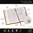 The stunning cover of the Medium Brown King James Version Deluxe Gift Bible with Thumb Index pays homage to a version of the Bible that has stood the test of time. An ornate filigree border design frames the gold foiled title and heat debossed edition imprint on the smooth front cover. The spine features heat debossed faux spine ribbing and version imprint, along with a gold foiled title. HOLY BIBLE Rich gold gilt-edged pages and an attached satin ribbon page marker add elegance to an already exquisite design. The standard 9-point type in a double-column format, thumb-index, reader-friendly subheadings, thematic Scripture verse finder, 8 full-color maps, and the words of Christ printed in red will assist you in Bible study. A one-year Bible reading plan is included to keep your Bible reading on track. A presentation page is included to complete with a special encouraging message in case you decide to give this beautiful KJV Bible as a gift. The Medium Brown King James Version Deluxe Gift Bible with Thumb Index comes packaged in a protective sleeve. This beautiful Classic King James Version Bible makes a thoughtful gift for a special birthday or a life event such as a graduation or an engagement. Brown Faux Leather Cover Heat Debossed design Gold Foiled Title Classic King James Version Gilt-Edged Pages Thumb-index Flexcover Lay-Flat Spine Attached Ribbon Page Marker Reader-friendly Subheadings Words of Christ in Red Ink Double-column Format Thematic Scripture Verse Finder One-Year Bible Reading Plan 8 full-color maps, Presentation Page Text Size: 9-point Type Size: 8.7" x 5.7" x 1.1" (221 x 145 x 28 mm)
