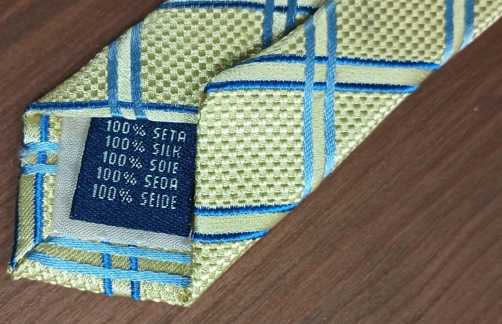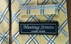 The Meeting Street Tie is a stylish and unique men's necktie made from 100% silk. Handmade with a striped pattern featuring shades of yellow, blue, and white, this tie is perfect for special occasions like weddings. The classic length and handmade accents add a touch of sophistication, making it a standout accessory for any man's wardrobe. Made in China, this tie is sure to make a statement with its vibrant colors and high-quality material.