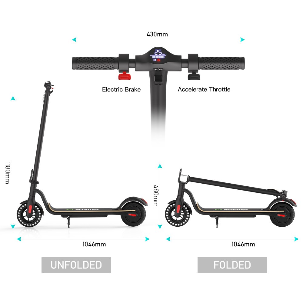 Main features: LONG RANGE BATTERY LIFE - Powerful 250W motor and 5.2 Ah/36V lithium battery pack that supports a speed of up to 15 Mph with a range up to 7 Miles. Updated large-capacity battery life, designed for commuters and longer distances. 8.0" HONEYCOMB & SOLID TIRES - Shock-absorbing rubber tires offer a smooth ride even over bumpy surfaces. PORTABLE FOLDING DESIGN - Electric scooter can be folded easily in 3 seconds with quick folding latch for easy carrying and storage. BATTERY INDICATOR AND LIGHTS - Battery indicator keeps to track battery life. Ultra bright LED headlight and taillight. Fast recharging about 4 hours. GEAR SHIFT SETTING - 1st gear for a 7 Mph comfortable ride or 3rd gear to get the 15 Mph fast experience. Extremely fun to ride and end boring commutes. Specification: Brand: Megawheels Model: S10 Dimension: Unfolding 105 x 43 x 118 cm; Folding: 105 x 43 x 48 cm Net Weight: 11.9kg Color: Black Frame Material: Aluminium Tires: 8.0" Honeycomb Front Tire & Solid Rear Tire Max Load: 100kg Max speed: 25KM/h Speed level: Gear 1--Max 10km/h ; Gear 2--Max 20km/h; Gear 3--Max 25km/h Mileage: 8-12km Grade Ability: 20 degree slope Working Temperature: -15°C-50°C Storage Temperature: -20°C-25°C Mode Type of Motor: Brushless hub motor Battery Type: High quality lithium battery Battery Capacitiy: 5.2 Ah Battery Voltage: 36V Charger Input Voltage: 100V-240V Charger Frequent: 50Hz/60Hz Charging time: 4 hours Package Contents: 1 * Folding Electric Scooter 1 * Battery Charger 1 * User's Manual NOTE:The appearance of the product you receive may vary slightly from the image shown due to differing production batches! Riding Skills: -Put your foot in the front of the scooter and the other foot on the floor before riding. -Make sure that the riding route is smooth. -Slide forward with the food standing on the floor before starting (like riding the scooter without power). -Immediately press the acceleration button and lean forward to avoid falling over backward due to inertia, so that the electric scooter will enter the working status. -Avoid pressing the handle with your body in the acceleration and deceleration process. Put one foot ahead and the other behind (like on the sliding plate/surfboard, put one foot ahead and the other behind by 70-90 for better comfort). -Turning – The turning principle of the electric scooter is the same with that of surfboard/sliding plate/skis. The handle shall be balanced with the body. Observe and make sure that turning is safe before turning. Tips: Before riding the scooter, please put one foot on the scooter deck and the other foot on floor and push the scooter forward by kicking the floor for some distance, in this way, the scooter will get some impulse to run forward. Note: This products have been certified under UL2272 safety standards. On Jul 6, 2025 at 20:03:33 PDT, seller added the following information: