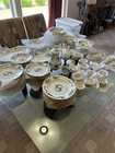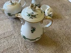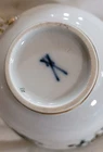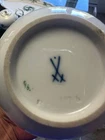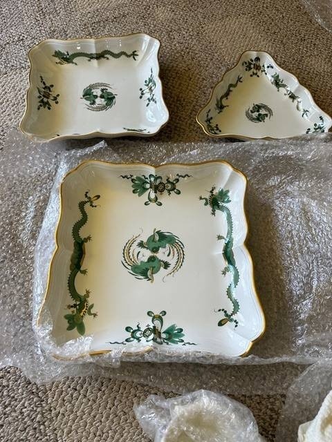 The Meissen Green Dragon, or "Ming Dragon," is a highly sought-after and classic porcelain pattern from the renowned German manufacturer, Meissen. This design is part of their extensive "Asian Collection," a series of patterns inspired by East Asian motifs that have influenced Meissen's work for centuries. History and Design Inspiration: The Green Dragon pattern is based on traditional East Asian, specifically Chinese, designs. The dragon is a powerful symbol in Chinese mythology, representing supernatural wisdom, change, and male power (yang). The design often features a dragon alongside a phoenix, which symbolizes the empress, wisdom, and benevolence. Evolution of the Pattern: While a version with an iron-red dragon and gold details was initially reserved for the Saxon court, Meissen began producing different colored versions for the public from 1858 onward, including the popular green variant. The "Ming Dragon": Around the turn of the 20th century, the "Ming Dragon" became one of Meissen's most famous designs. This pattern was inspired by Chinese mythology and lore, leading to a distinct interpretation of the imperial dragon. Value and Collectibility The value of Meissen Green Dragon pieces can vary widely depending on several factors: Age: Older pieces, particularly those from the late 19th and early 20th centuries, tend to be more valuable. Condition: Excellent condition with no chips, cracks, or significant wear to the gilding or paint is crucial. Type of Piece: Larger and more complex items like dinner services, vases, and platters are typically more valuable than single cups or plates. For example, a full dinner service can be worth thousands of dollars, while a single cup might be worth a few hundred. Quality and Markings: "First quality" pieces are the most desirable. You can often identify them by the marks on the base. Identifying Authentic Meissen Porcelain To determine if a piece is a genuine Meissen item, look for the following: Crossed Swords Mark: This is Meissen's official trademark, introduced in 1720. The mark is applied in underglaze blue and has evolved over time. You should research the specific marks associated with different time periods to help date the piece. Quality of the Porcelain: Authentic Meissen porcelain is known for its fine, translucent body and smooth, flawless glaze. Painting and Detailing: The hand-painted decoration should be precise, detailed, and consistent with the style of the period. Meissen artists were known for their exceptional skill. Model and Painter Numbers: Many pieces will have impressed or incised model numbers and painted painter numbers on the base, which can be used for further research. Provenance: Knowing the history of ownership can add to the value and help confirm authenticity. When buying or selling, it's always best to consult with a reputable dealer or a professional appraiser who specializes in antique porcelain to ensure authenticity and get an accurate valuation. set includes 100 pieces + Plates 22 Large 9 ½” 12 Medium 8 ½” 12 Small 7 ¾” Platers / Misc 1 large 21 ¾” 10 ¾” 1 medium 16” 11 ¾” 1 medium 10 ¾” 1 medium 9 ½” 1 gravy boat 10” 6 ½” (overall lower tray) 5 misc 1 ¾” Smaller plates and bowls 12 Bowl 9 ¼ 12 Sm plate 7” ` Various platters and cups.. 11 cups 3 ½” 11 5 ½ cup saucers 1 Platter 10 ½” 1 Platter 9 ½” 1 Triangle platter 8” Various pitchers 1 Tea kettle 5 ½” by 5 ½” 1 Liquid pitcher 10 ½” 1 Creamer container 5 ½” 1 Sugar dish 3 very very good condition Almost twine sword mark. Only tea pot and coffee pot and sugar bowl with lid and creamer has dot under the swords.