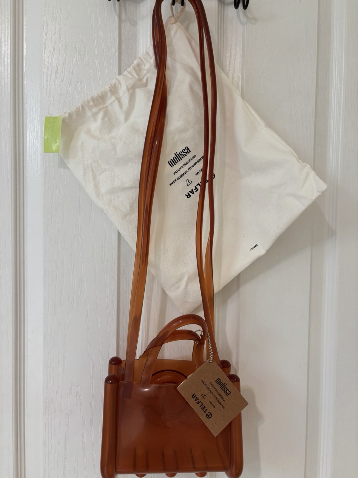 The Melissa x Telfar Small Brown Jelly Crossbody Bag is a stylish and trendy accessory for women. This brand new bag comes with tags and a dust bag, making it a perfect addition to any outfit. Made of PVC material, this small-sized bag features a crossbody style with a matching PVC strap. The exterior color is a chic brown, adding a touch of sophistication to any look. With its compact size of 7 inches in width, 6 inches in height, and 4 inches in depth, this bag is both practical and fashionable for everyday use.