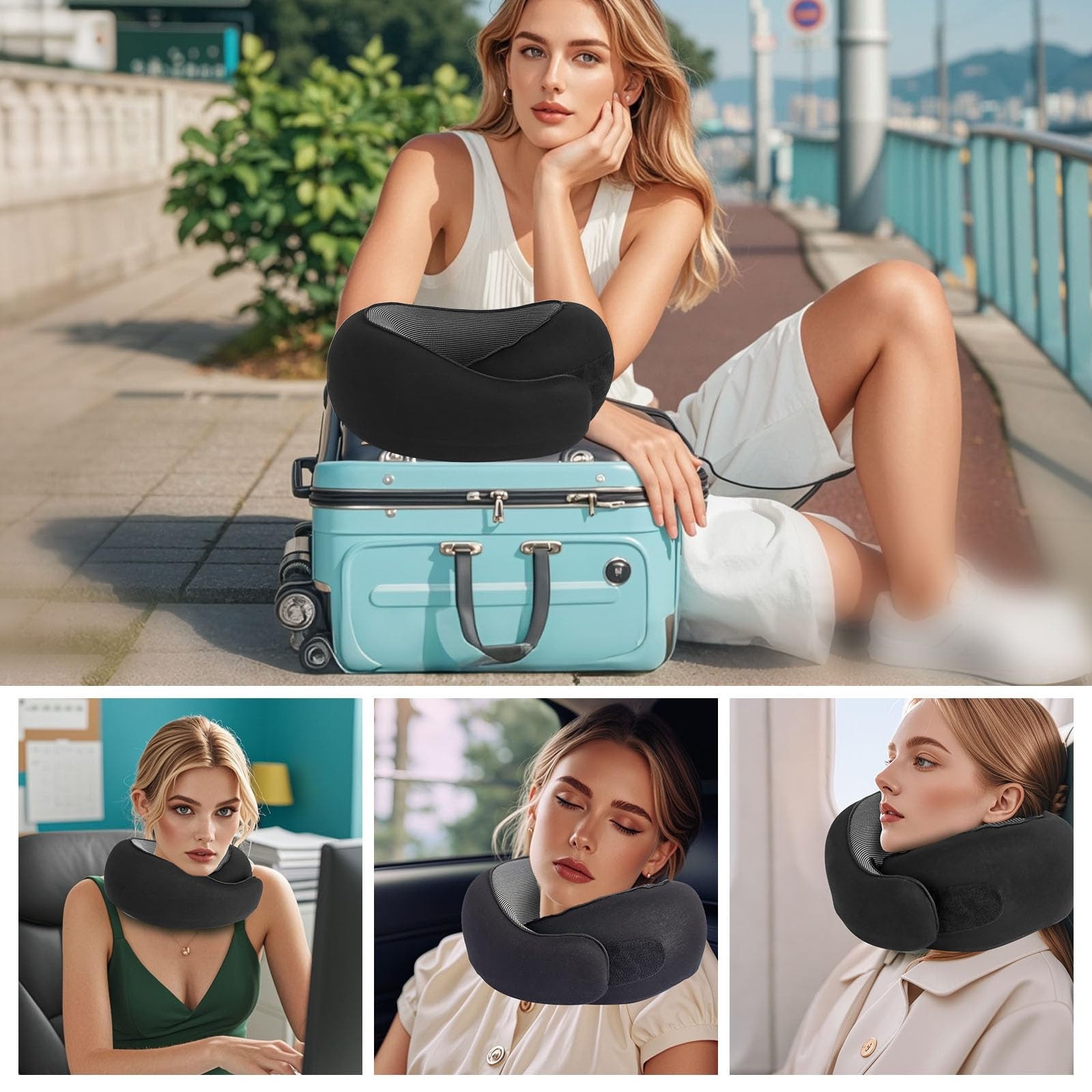 Travel Pillow Makes Your Travel More Comfortable What is unique about our product? Ergonomic appearance - perfectly supports your neck Slow rebound memory foam - better supports your head Pure cotton fabric - skin-friendly and more comfortable Portable storage design - convenient for storage and more convenient for travel Removable cover - the cover can be removed and washed to keep it clean Includes: Neck pillow x1 Eye mask x1 Earplug x2 Storage bag x1 Specifications: Material: cotton + polyester fiber Color: pink 【Travel Pillow Set】: All-around match for you to enjoy perfect rest. Includes: 1pc travel neck pillow, 1pc storage bag, 1pc eye mask, 1 pair earplugs, and 1pc beautiful packing gift box. 【Memory Foam Travel Pillow】: Travel pillow with the latest filling technology and memory foam, strong rebound. Memory Foam Travel Neck Pillow with 5 seconds rebound technology, comfortable and durable, freely adjustable elasticity. 【Anti-Stick Design】: Our neck pillow made the optimal Velcro design, tear off the anti-damage fabric when using, paste the right size for you, and can better prevent other things from sticking to it when not in use. Thoughtful service only for you to meet 【Ergonomic Design】:Our travel pillows are designed with ergonomic neck and chin wraps, which can keep you in an upright position and relieve neck, shoulder and back discomfort caused by traveling by car and airplane. 【Easy To Carry】: Make your trip more comfortable with our travel neck pillow. The neck pillow for airplanes can be easily rolled up and packed into a waterproof bag for easy carrying, and the outer layer is removable/washable for easy cleaning. The outer layer is made of breathable cotton fabric which is soft and flexible, sweat absorbing and skin-friendly. Use the airplane neck pillow for optimal convenience during commuting, camping or any travel.