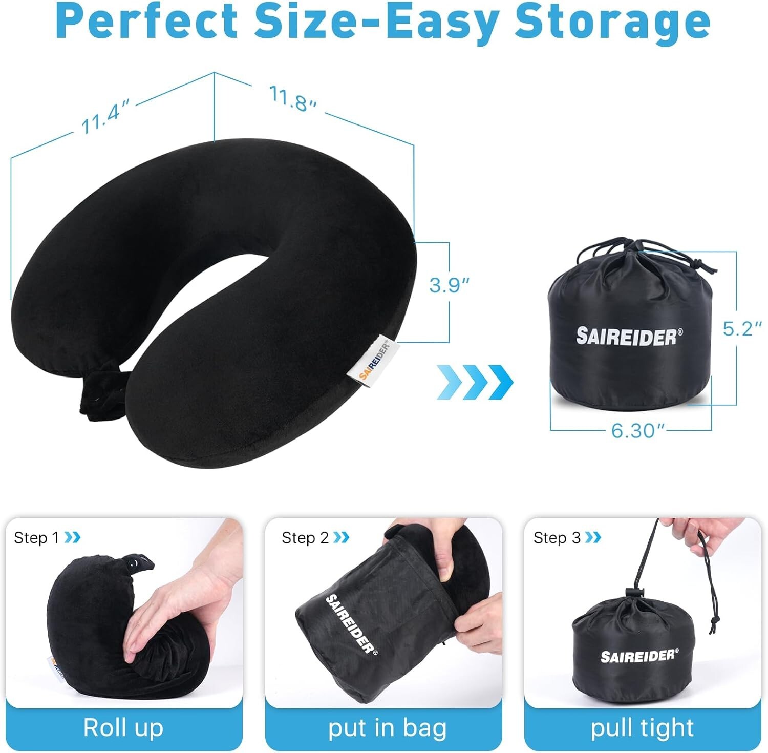 SAIREIDER Travel Pillow 100% Pure Memory Foam Travel Neck Pillow with Storage Bag, Airplane Pillow for Traveling、Car、Home、Office,Washable Cover(Black) Classic style:360 ° all-around support for your neck, head, and chin, Make your travel and rest easier High quality materials :100% Pure Memory Foam and Soft and skin friendly fabric Adjustable: Two rows of buttons, three adjustable sizes to help you always use the travel pillow in the most suitable size Machine washable: Durable, easy to care for, always kept clean Easy storage: with storage bag, the size after storage is only 6.3 inches * 5.2 inches, easy to carry Risk-free Try: We believe that you would like our travel pillow,But if you meet any problem or feel unsatisfied while using it, please feel free to contact us and we would provide a 100% satisfactory solution for you in 24 hours.