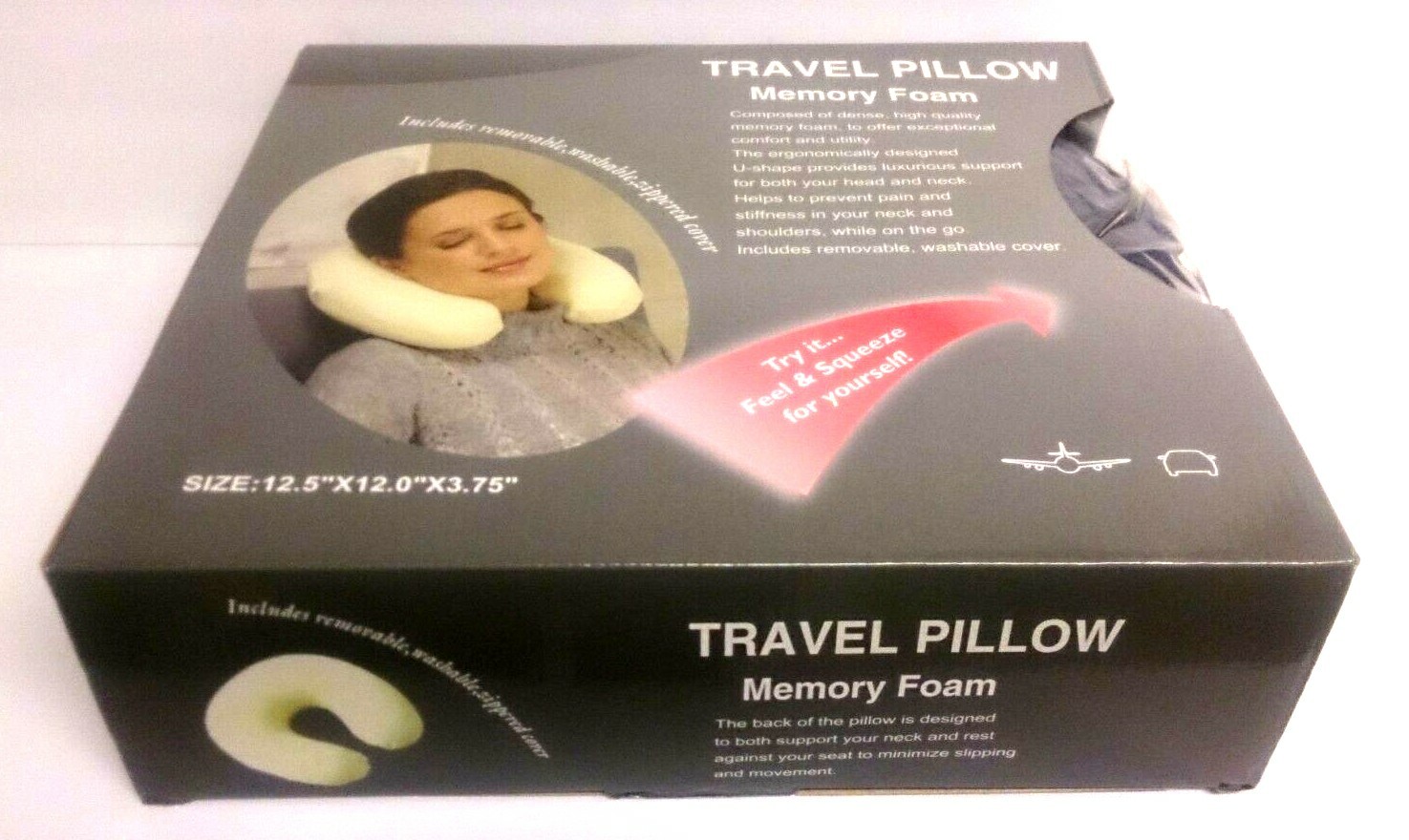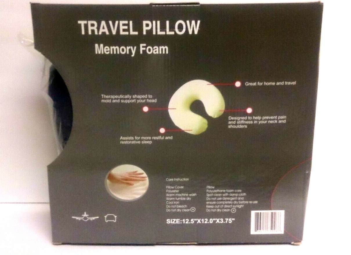 Travel Pillow Memory Foam U shaped Neck Support Head Rest Therapeutically shaped Brand New in Original Retail Box Color: Dark Blue Composed of dense, high quality memory foam, to offer exceptional comfort and itility. The ergonomically designed U-shape provides luxurious support for both you head and neck. Helps to prevent pain and stiffness in your neck and shoulders, while on the go. Assists for more restful and restorative sleep. Includes removable, washable cover. Size: 12.5" x 12" x 3.75"