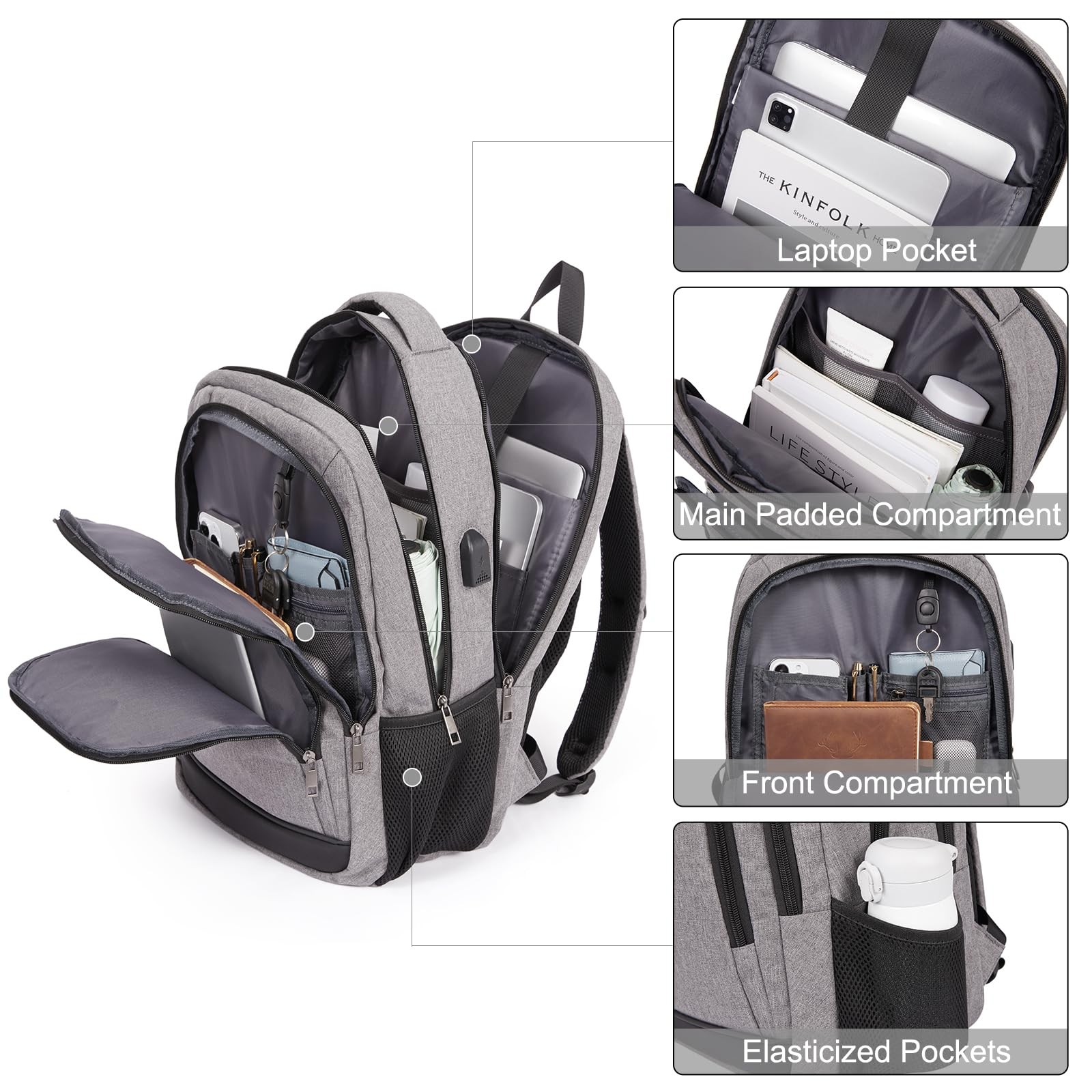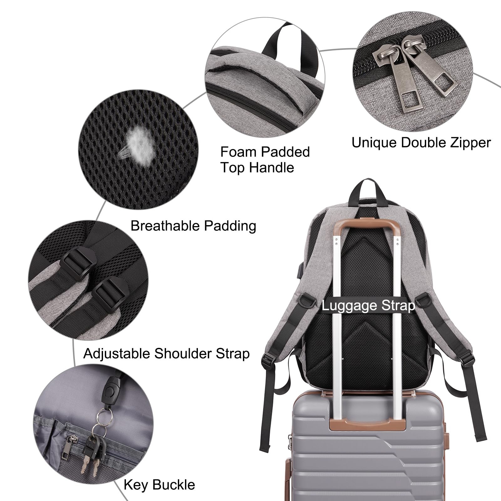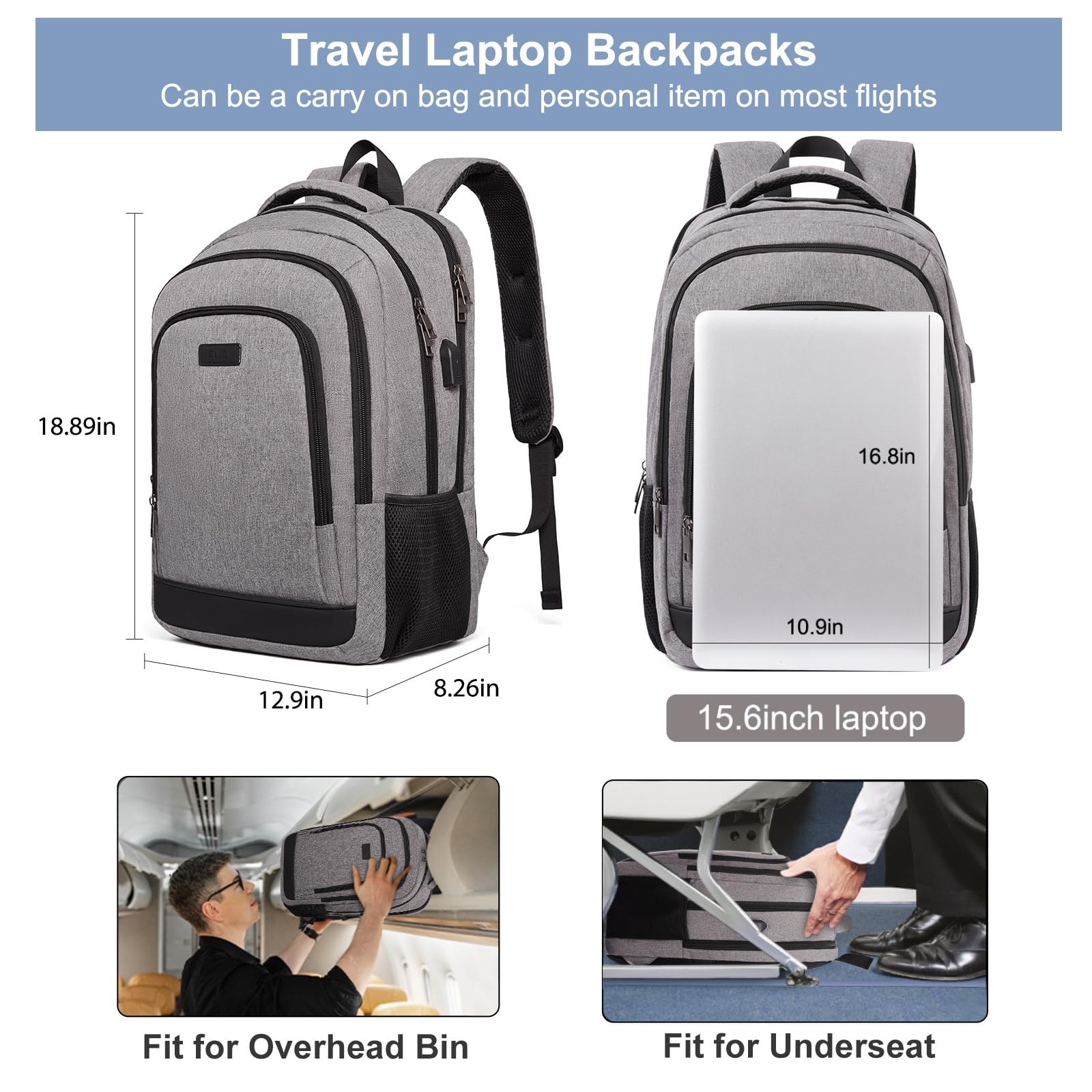 LARGE CAPACITY&LAPTOP COMPARTMENT: This laptop backpack for men contains 3 main zipper compartments.The main compartment comes with one separate padded laptop compartment of our travel backpack can hold 15.6 inch laptop,clothes,daily necessities,tech electronics accessories and college items.Front compartment with many zipper pockets, pen pockets and key fob hook, make your items organized and easier to find.Mesh pockets at side for water bottle and compact umbrella. HIGH-QUALITY MATERIAL: Size (L) 12.9 x (W) 8.26 x (H) 18.89 inches, weight 1.74 pounds. The school backpack is made of High-Density,Light and Durable,Smell-Less,waterproof Polyester material with smooth metal zippers design. Lightweight and breathable materials reduce the burden of use. LUGGAGE SLEEVE&COMFORTABLE BACK:The backpack back luggage strap allows travel laptop bag fits on suitcase, slide over the luggage upright handle tube for easier carrying.Comfortable airflow back design with thick and soft multi-panel ventilated padding,gives you maximum back support. Wide breathable and adjustable shoulder straps with many foam padding relieve the stress of the shoulders. USB CHARGING PORT DESIGN: This college bookbag with built-in charging port enables you to charge your phone anytime and anywhere. Connect the mobile charge to the internal data cable of the backpack to realize the charging function. (Note: power bank and data cable are not included). Realize easy charging and convenient travel! VERSATILE BACKPACK: Great to use School Backpack/Laptop Backpack/College Bookbag/Travel Backpack. The water resistant backpack can be used in several different ways, appropriate for schoo,work short-distance travel and daily use. Best choice of gifts for men & women as Christmas gifts, Thanksgiving gifts,or Valentine's Day gifts.