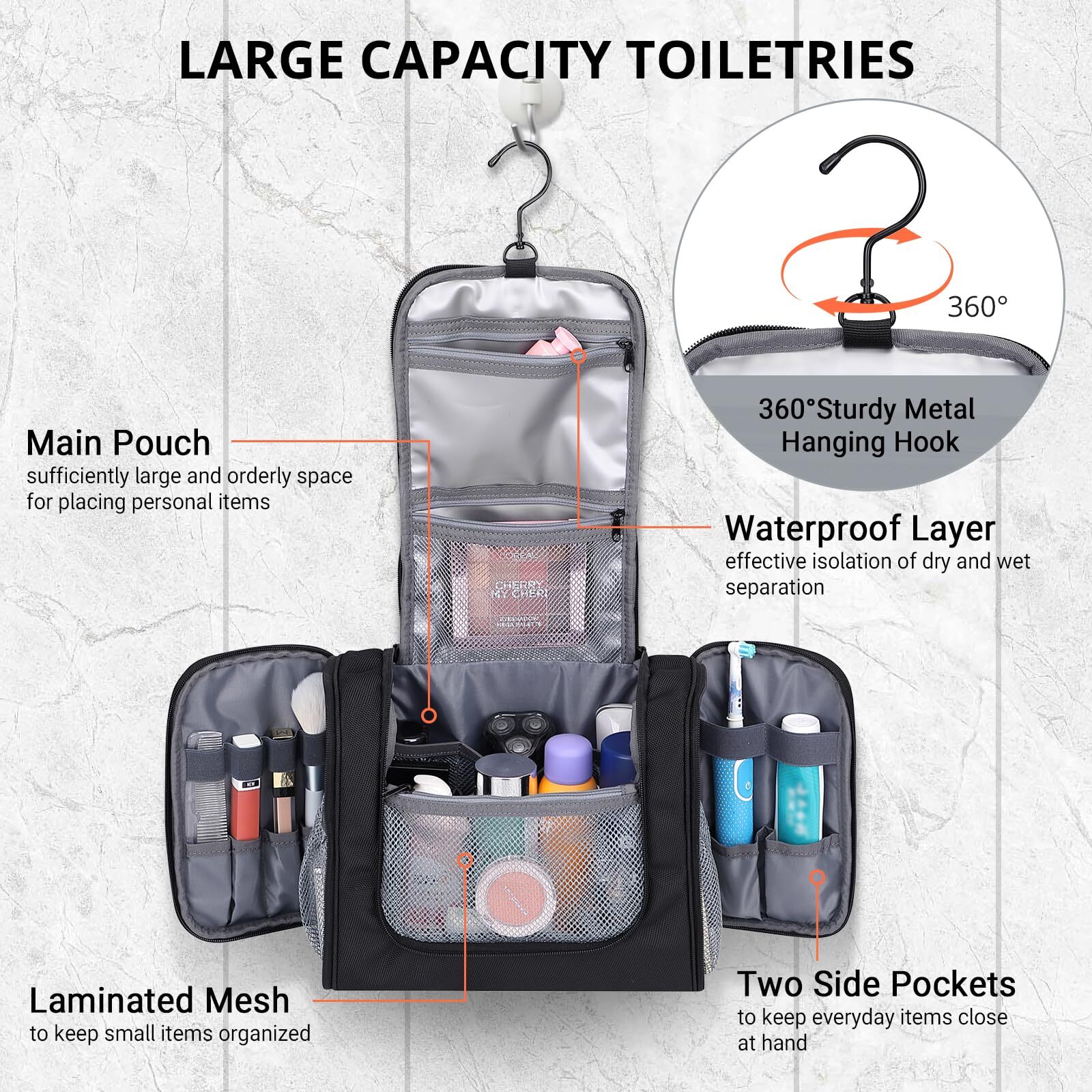 This toiletry bag is a game-changer for travel! The spacious design fits all my essentials, and the multiple pockets keep everything organized. I love the water-resistant fabric—perfect for wet bathroom counters. The hanging hook is super convenient, and the sturdy material feels durable. Compact yet roomy, it’s ideal for both short trips and long vacations. Highly recommend for anyone needing a reliable, well-designed toiletry organizer!