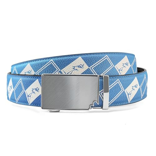 Men’s Adjustable 35"-40" Leather Belt with Grey Silver Buckle in Blue Check Design