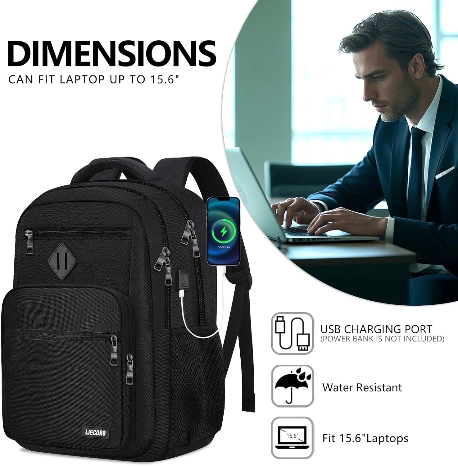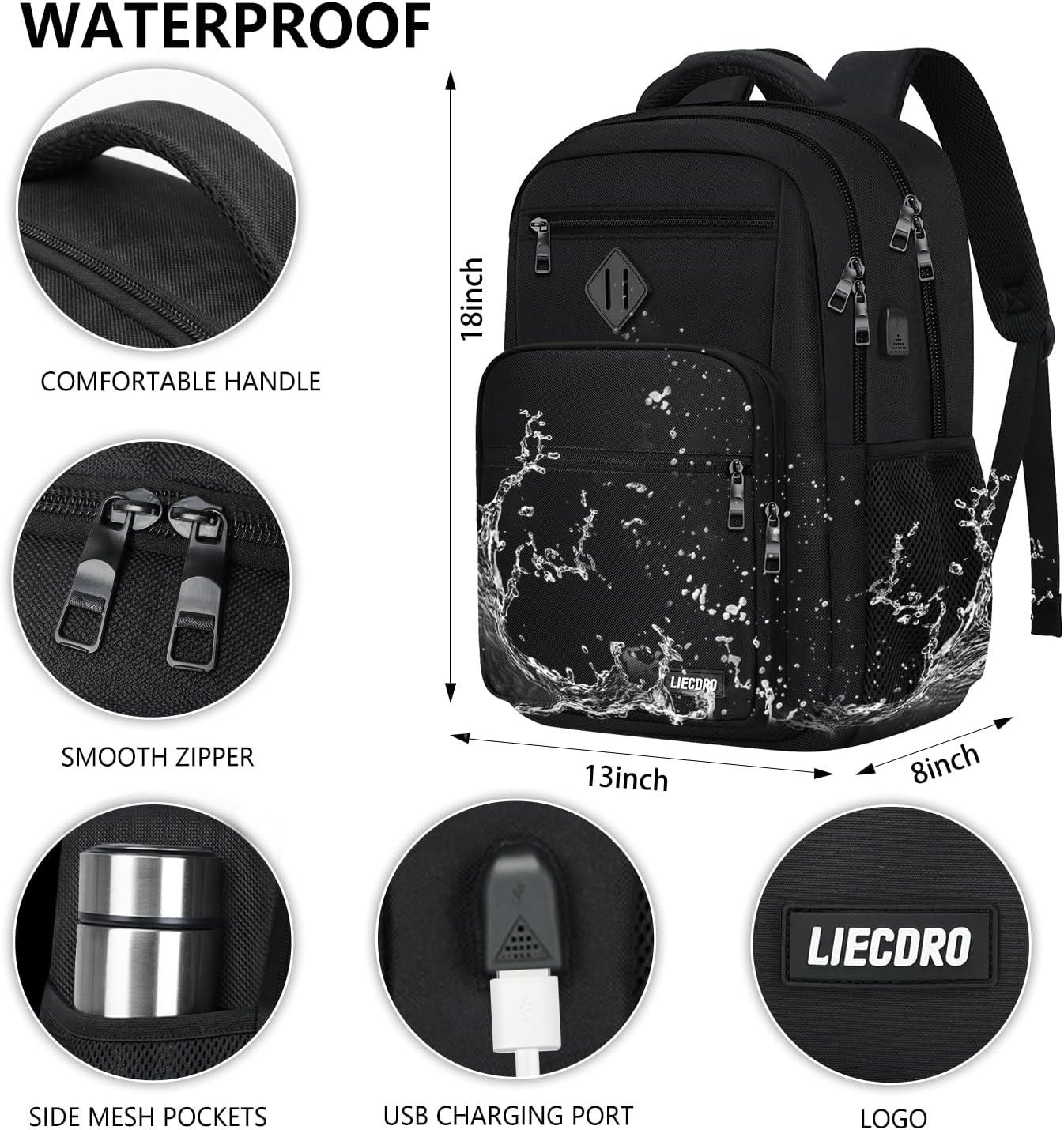 Store New Arrivals Add to Favorite View Feedback Contact Black Backpack for Men, School Backpack for Boys Teens,15.6 Inch Laptop Back Pack with USB Charging Port, Backpacks for School Business Work College Travel, College Book Bag, Bookbag Description Age Range Description Over 3 years old Capacity Total 30 Liters Color D3-black Product Dimensions 8 x 18 x 13 inches Item Weight 1.74 pounds Department unisex-adult Size 15.6 Inch 【LARGE CAPACITY & WATERPROOF】The mens backpack is made of high density waterproof polyester. There is an independent laptop protection compartment, which can fit a 15.6 Inch laptop. The front of the black backpack also includes 4 pockets of different sizes, which can store passports, power banks, pencil cases, clothes and other items needed for daily school, study, office and travel. 【ERGONOMICS & LUGGAGE STRAP】Comfortable airflow back design with thick and soft breathable padding gives you maximum back support. Adjustable "S" shoulder straps relieve the stress of the shoulders,A luggage strap allows mochilas para hombres fit on luggage/suitcase, slide over the luggage upright handle tube for easier carrying. All ergonomic functions ensure comfortable and safe everyday & long-lasting travelling usage. 【USB PORT 】Charging college backpack with an external charging port & built-in charging cable, this laptop book bag with a USB charger port provides you a more convenient way to charge your electronic device via connecting your own power bank while walking or cycling. (POWER BANK is not included) 【FUNCTIONAL BACKPACK】Metal Zipper allows it to slide easily and smoothly. plenty of pencil pouches for school supplies.Hidden anti-theft pocket protect your valuables from stealing. Boys backpack made from high quality polyester fabric shockproof with high density nylon lining for Better tearing 【FOR ANY AGES & OCCASION】 The lightweight backpack is stylish enough for casual and student use, while the design provides the multi functionality. Backpack perfect for young teens, boys. The basic multipurpose daypacks for most of your needs, easy to match your cloths, suitable for short trip, travelling,work, shopping, university, elementary school, etc Product Description Travel Laptop School Backpack for Men/Women/boys/girls HIGH QUALITY: This well-made laptop backpack is made of premium waterproof polyester fabric, sturdy zipper and reinforced stitching, which is durable, lightweight and tear-resistant. MULTIPLE POCKETS: 15.6" extra large backpack with plenty of compartments and 15+ pockets to help you organize all your belongings, which make your items organized and easier to find. USB CHARGING PORT: The college backpack is with external USB charger port and built-in charging cable can conveniently charge your phone, tablet and other electronic devices while walking. MULTIPURPOSE: With classic and minimalist design, perfect for use as laptop backpack, college backpack, work backpack, daily backpack, travel backpack, business backpack, or carry on backpack. How does LIECDRO School Backpack meet your inquirement? Offering a large capacity of up to 30L, it is convenient for you to store more items. Backpack with charge port, it offers you a convenient access to charge your device while walking, business trip or back to school. The backpack is made of high-quality water-resistant polyester fabric, which is not easy to get wet or torn, ensuring long-term use. Luggage strap allows the backpack to be fitted on luggage, slide over the luggage handle tube, less burden on your shoulder and back when on the go. 15+ pockets offer separate space for you to organized various items like notebooks, files, passport, pen, keys, wallet, folders, books, clothes and etc. What storage space does this backpack have? 1 Laptop Compartment: It can hold 15.6 Inch laptop as well as 15 Inch,14 Inch and 13 Inch Laptop. Main Compartment: Roomy for tablets, mouse, charger, binders, books, files, etc. 1 Front Organized Pocket with 3 Pen slots; 3 Slip pockets; 1 mesh zip pocket can store items such as books, files, cards, passports,etc. 2 Side Pockets: For water bottle and umbrella. 3 Front zip pockets easy access passport, earphones, tissue, purse or other small accessories; 1 Back anti-theft pocket holds important items like credit cards, ID card, passports; This laptop backpack can be used as a school backpack, travel backpack and backpack for daily use, work, weekends, outdoor vacations, travel, fitness, hiking and other activities. Kind Reminder: 1-2cm error of measuring is a reasonable range due to different measurment methods. Water-Resistant Backpack Product Description Dimensions: 18 x 13 x 8 Inches Maximum Laptop Size: 17.3 Inch Weight: 1.5lbs Material: Water-Resistant Polyester Color: Black/Grey/Beige/Blue/Pink/Cyan Black Backpack for men/women/Boys/Girls Thoughtful Design for Extreme Convenience Multifunctional Laptop Backpack This laptop backpack can be used as a work backpack, travel backpack and student backpack for daily use, work, weekends, outdoor vacations, travel, fitness, hiking and other activities. USB Charging Port Hidden anti-theft pocket Side water bottle pocket Multiple pockets for easy access Great gift idea: It is the special beautiful gift for boys, girls, father, hasband, son, daughter, lover, mens, friends on Father's day, Birthday, Valentines' day, Christmas gift, New Year gift. ABOUT US We offer the best prices around on high quality products. Our E-store includes media such as books, movies, music and games while offering electronics, toys, sporting apparel, clothing, tools, general home, garden items and more. SHIPPING We are always working hard to ensure your package arrives as soon as possible. Please understand that some factors like weather, high postal traffic, and the performance of shipping companies are outside of our control. We offer free shipping to the lower 48 states and ship within 2 business days of payment, usually sooner. We do not accept 