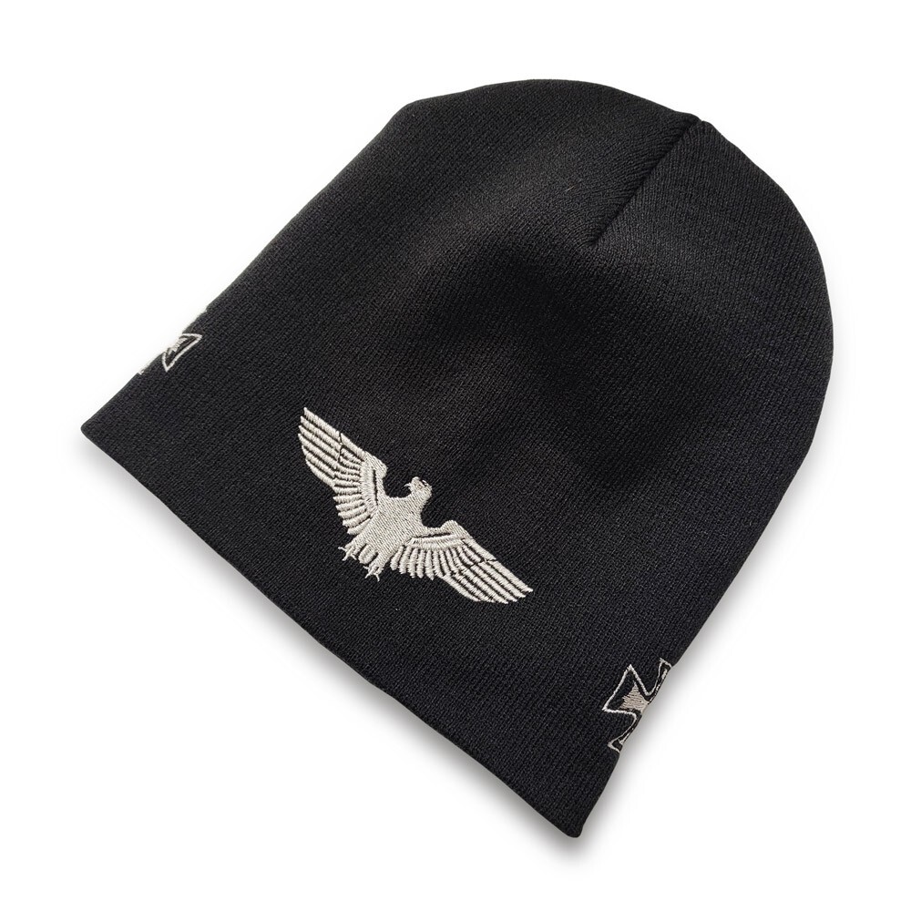 Eagle hat with crosses winter knitted with embroidery from rock store "Talisman". A large selection of hats. Rock caps, baseball caps, caps, bandanas for rockers, metalheads and informals. Color: black. Size: width 22 cm, height 24.5 cm. Material: 100% polyacrylic. A warm two-layer, sizeless beanie hat with high-quality embroidery.