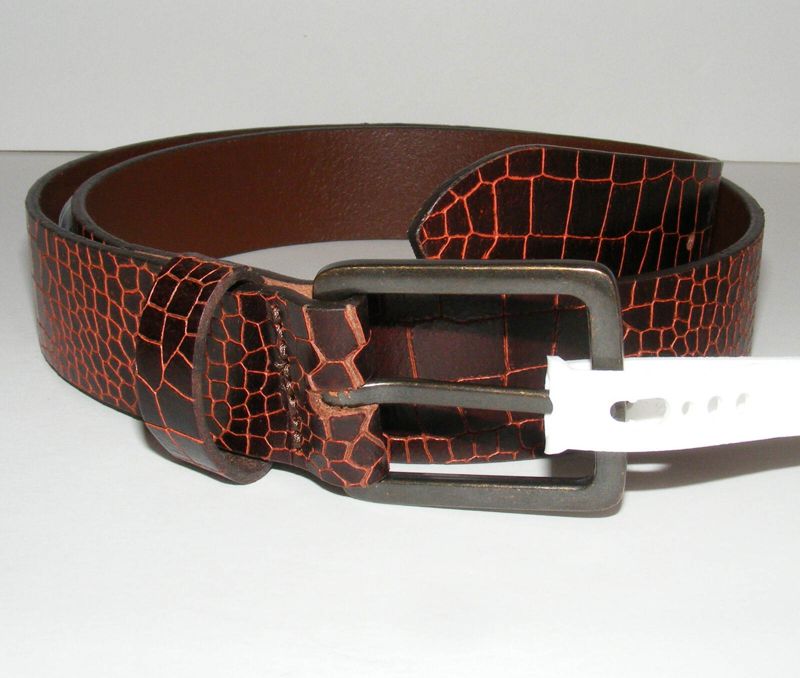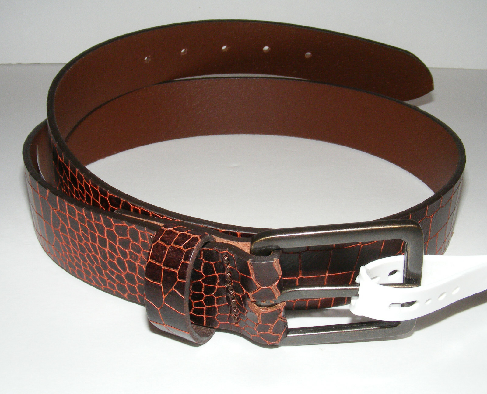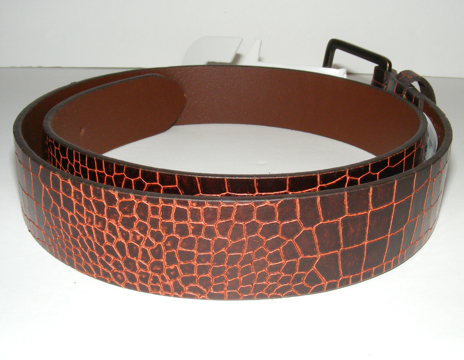 Brand new women's leather croc belt by Time and Tru. Material: leather. Pattern: embossed crocodile skin print. Manufacturer's color: brown. Available size S / M legth 37½", width: 1¼". Metal buckle.