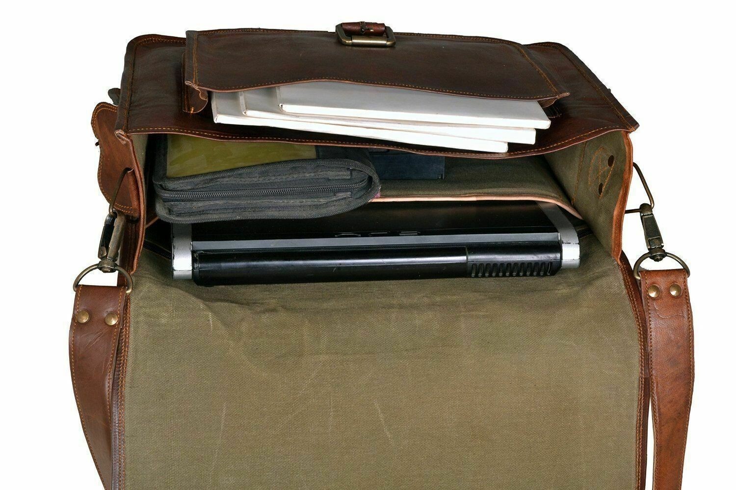 100% genuine goat leather messenger bag with a durable inner lining made of canvas. Designed to carry mini laptops, tab, documents or other personal belonging. A genuine hand made product using chemical/dye-free leather. Natural oils and light have been used to obtain the style of the leather - chemical free! This bag features a wonderful unique and vintage look, designed to carry mini laptops, tab, documents, personal belongings. Perfect for the office, school or as a gift! Specifications: Size:-X Large 12x16x5" inch Made from 100% genuine, strong, lightweight, durable goat leather, tanned without the use of chemicals Adjustable shoulder strap, half flap bag with strap lock & small front pocket. 3 big inner compartment for carrying tablet, smart phone's, tab's etc. 2 zipper compartments for important documents/paperwork etc. 1 large pocket in front & 2 small pocket in side. Inner canvas lining Vintage leather wash Leather softens and darkens with use Handmade in India by experienced crafts people.