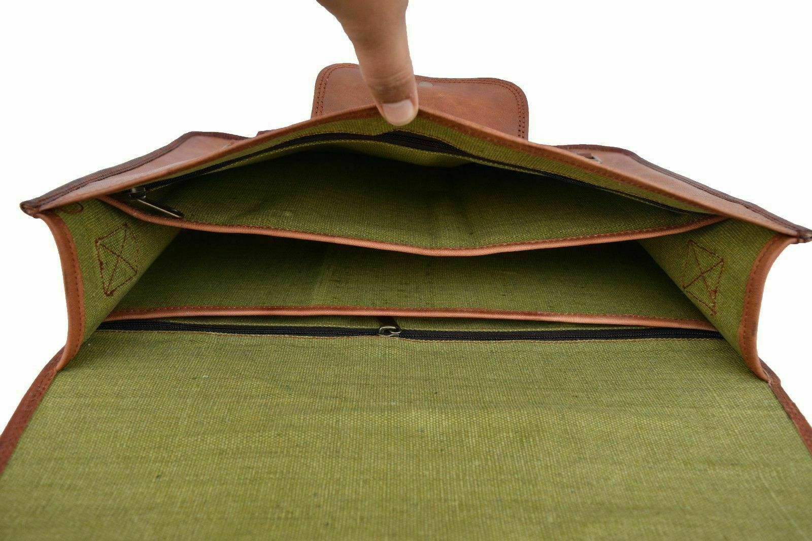 Description Handmade Goat Leather Satchel Sling Messenger Bag QUALITY LEATHER BAG Each bag is individually made using goat leather by experienced crafts people .The bag gets better and better with the time as the leather softens and deep-ens in color. The tonality color of each bag might vary in accordance with the low and high temperatures from the heart of The Thar desert.The leather does not receive any chemical treatment. On the bags a special vegetable oil is applied to give more tonality to the dominant brown (light and dark) color of the bag also making it more resistant to the water.Each bag has its charm and style and a very special earthy smell that will assure you it’s real leather.Its lightness, flexibility and durability will not make you regret your purchase. HANDMADE GOAT LEATHER SLING SATCHEL BAG FOR Men's & Women's Features Green canvas fabric Internal 2 compartments and 2 zipper Front 1 Small Pocket Thick adjustable strip (See the picture for more detail) Strong, light-weight goat leather, tanned without the use of chemicals Leather softens and darkens with use Color and texture of the leather varies Natural real leather smell, just like a luxury car or lounge suite Solid brass buckles and fixtures - will last for years Has a wonderful natural look, and feel Each bag is uniquely individual due to slight color and marking variations on natural leather Brand New Handmade Leather Bag without tag.