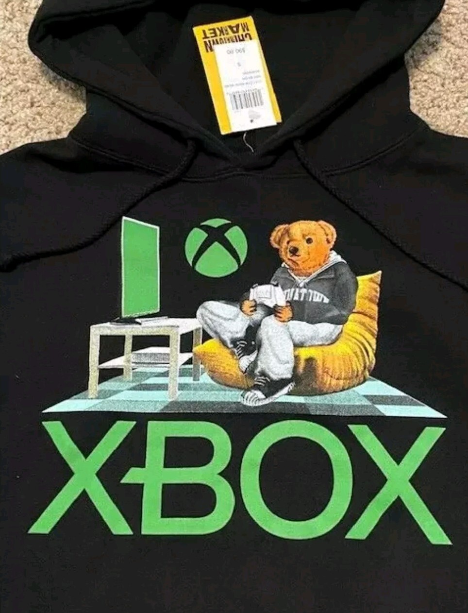 This Chinatown Market hoodie is the perfect addition to any gamer's wardrobe. The black fleece fabric is comfortable and warm, making it ideal for gym and cross-training sessions or casual wear. The drawstring closure and round neckline provide a secure fit, while the hooded design adds an extra layer of warmth and protection. Featuring a graphic print of a bear from the Xbox gaming console, this hoodie is a must-have for any Xbox fan. The size S hoodie is designed for men and has a pullover style, making it easy to wear with any outfit. Whether you're going for a casual look or hitting the gym, this Chinatown Market hoodie is a great choice.