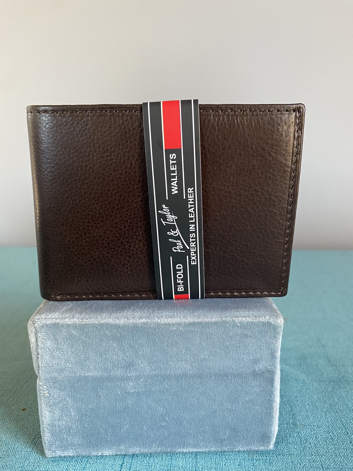 Wallet for Men's Genuine Leather Bifold with two flaps, opens with upper side and 12 credit card holders, two picture IDs in the color brown ,two hidden pockets, and two pockets for bills. Available in three colors, black, brown, and tan. We deliver untouched packaging.