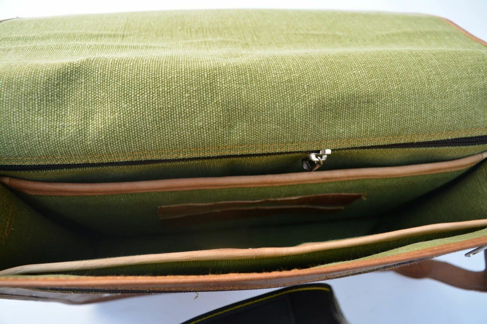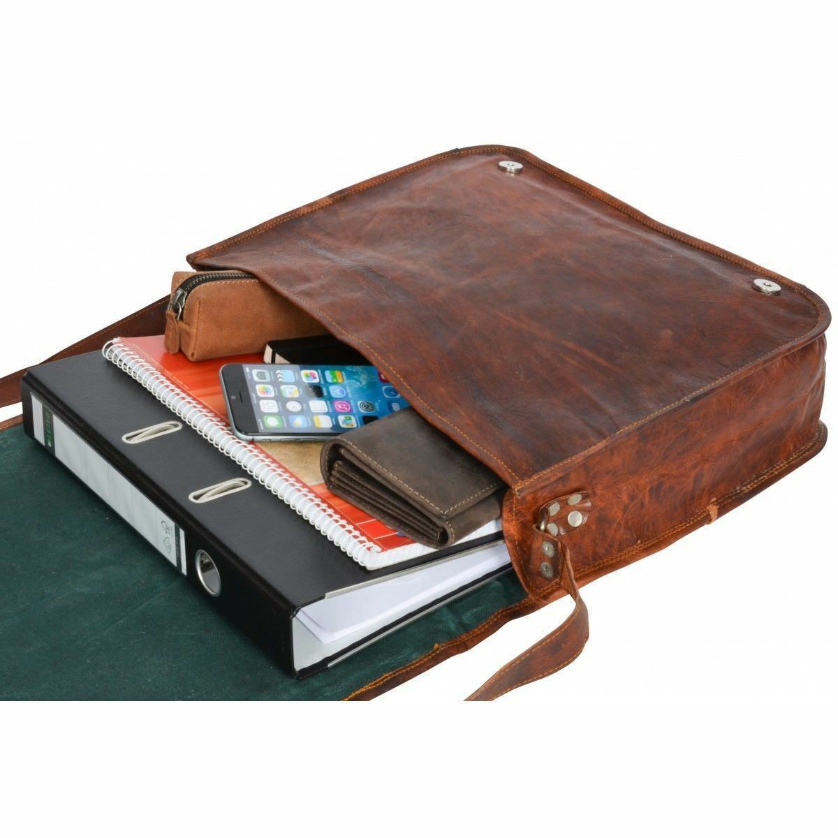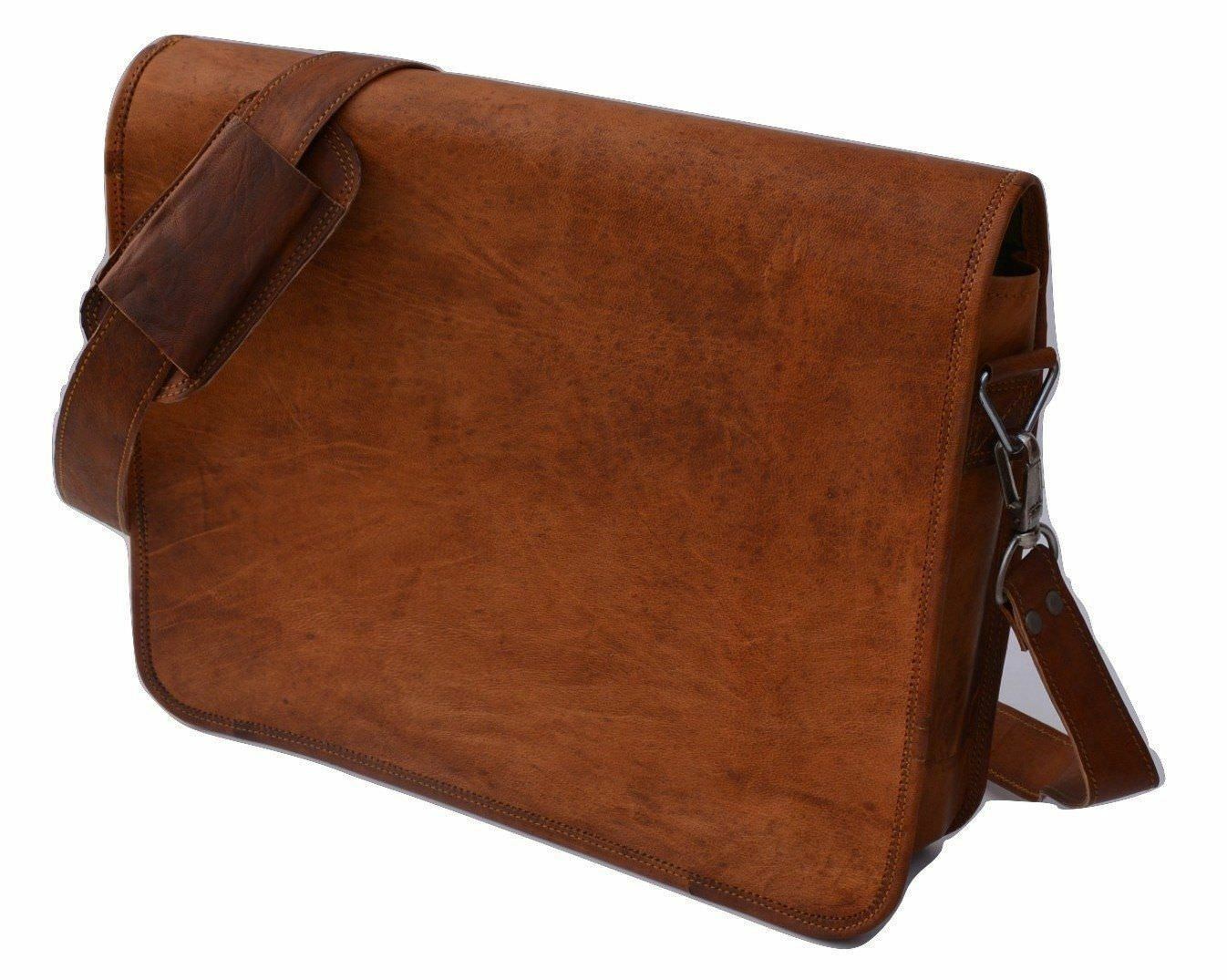 IMPORTED & DURABLE : Handmade Leather Men carryall distressed messenger bag is made of superior cr Goat full grain aniline leather canvas inner lining. Disordered WRINKLES, CUTS & SCRATCHES on surface create raw character wild look with strong sensuous aroma of virgin leather. IF YOU ARE VEGAN OR DON’T LIKE LEATHER SMELL, THIS IS NOT FOR YOU GUSSETS: Business executive organizer, multiple holders for- mobile, visiting card, pen, key chain, pen drive. 2nd – for tablet PC laptop, with thick shock proof padding. 3rd - for books, A4 size files, journal, umbrella, wallet, iPad mini, accessories. 2 inner chain compartments for storing important documents. Outer Back Zipper pocket for easy storage. HANDMADE GIFT, MADE WITH LOVE: Can gift on occasion of- first new job to teen boys & girls, men & women, promotion, farewell, birthday, marriage anniversary, Christmas, New year present, thanksgiving, father’s day, independence day, memorial day, corporate gifting to him & her. No questions asked policy. Designed in Italy, made in India, BUY NOW WITH FULL CONFIDENCE SKIN FRIENDLY & NON-ALLERGIC: Multi-utility carryall Man bag, woman office work bag has full length adjustable shoulder straps - 55 inches which can be adjusted with maximum shoulder drop - 26 inch & can be adjusted to make a short shoulder day pack work bag to perfectly match your favorite casual outfit. Wear as cross body day bag office bag helpful to ease your fatigue in long commutation from office work to home CONVENIENT MAGNETIC SNAP: Laptop messenger bag is double secured by magnetic snaps and premium zippers. Inner padded laptop sleeve fits unto laptop. Gift this study book bag which is easy to carry for school, college, library, business, work, travel, airplane carry bag overnight, etc. to your boyfriend now. EASY 30 DAYS MONEY BACK GUARANTEE, SHOP NOW SIZE -- 11 X 15 X 4 inch Features: Bought yourself a laptop & now want the Best Leather Messenger Bags for Men that look amazing, classy & keep everything organized for the Men? If yes, then Handmade Leather Bags brings the hot trending Men’s Fashion high quality leather work messenger bags for ipad, laptops & tablets to your door steps Whether you are going on your first interview or an executive professional doing a daily commute to work or going for a client meeting, Handmade Leather men's shoulder messenger bags will not only demonstrate your sense of style, but will also last for several years Color & Texture: These leather satchel bags ages gracefully like fine wine & becomes more distinguished as time goes on.