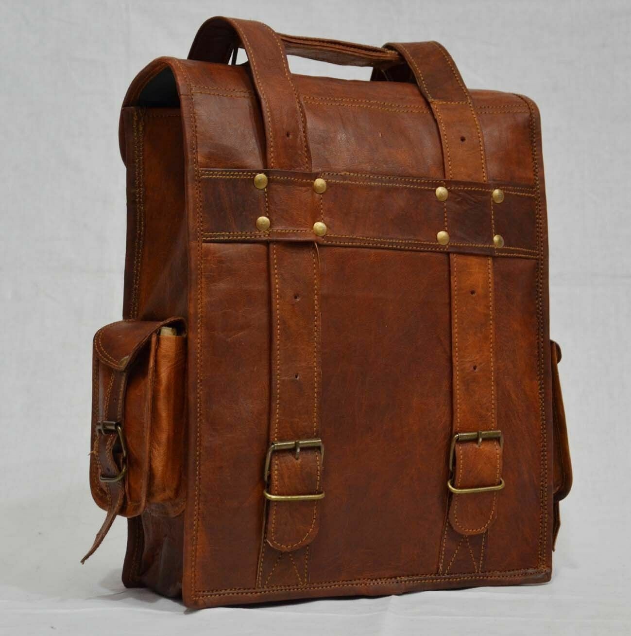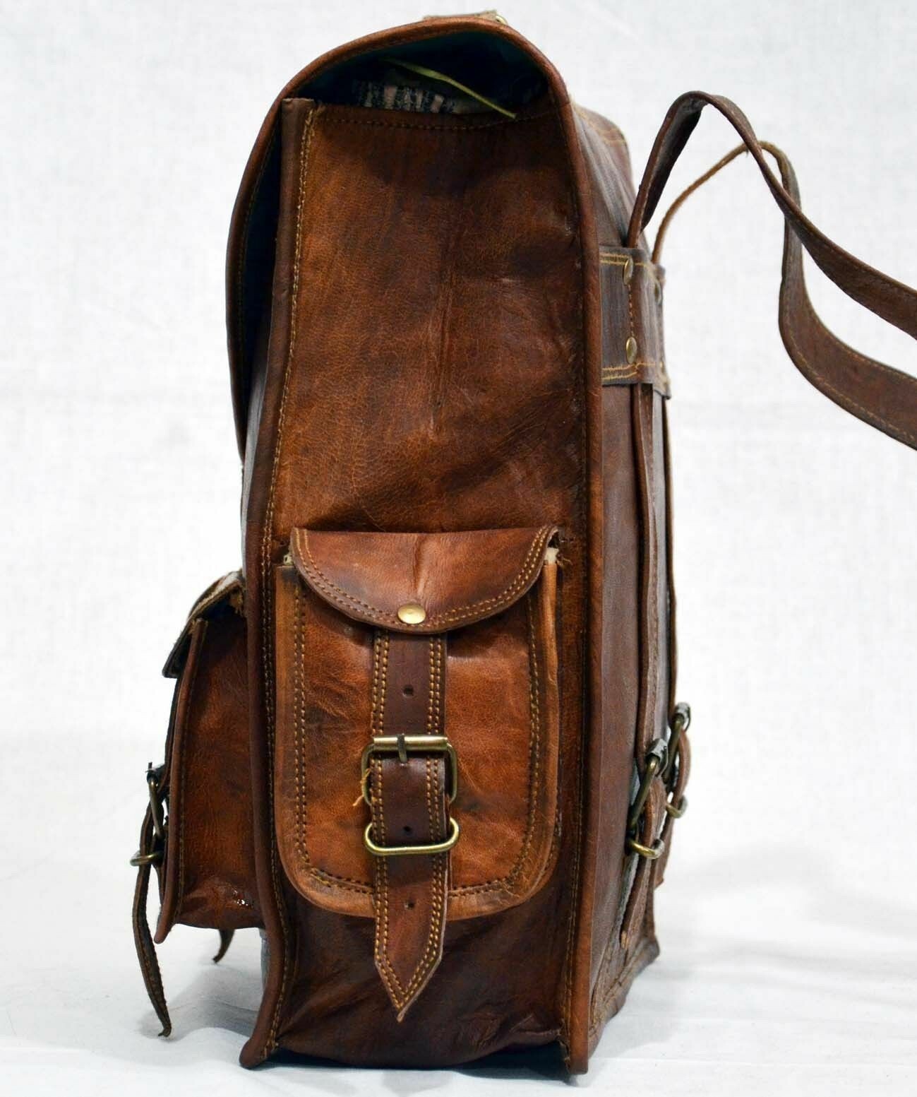 Leather Backpack Rucksack Sling Satchel messenger bag 2 in 1 purpose 100% genuine goat leather messenger bag with a durable inner lining made of canvas. Designed to carry mini laptops, tab, documents or other personal belongings, etc. A genuine hand made product using chemical/dye-free leather. Natural oils and light have been used to obtain the style of the leather - chemical free! This bag features a wonderful unique and vintage look, designed to carry mini laptops, tab, documents, personal belongings etc. Perfect for the office, school or as a gift! Specifications: Size:-13 x 17 x 6'' XX Large Made from 100% genuine, strong, lightweight, durable goat leather, tanned without the use of chemicals Adjustable shoulder strap, roll close backpack with small front pocket. 2 big inner compartment for carrying files, mini laptop's, tab's etc with padding. 2 zipper compartments for important documents/paperwork etc. Inner canvas lining Vintage leather wash Leather softens and darkens with use Handmade in India by experienced crafts people Please provide your telephone number as well, so that the post office can contact you when your item arrives, or the item will be sent back to us. We will not be able to resend the item in that case so please make sure to provide your contact number. Please do provide your full address and phone number by eBay message immediately after making the payment for easy delivery. We normally ship within 1 to 2 days. We will offer the tracking number you can track it during the whole shipping process after shipment please check your tracking number after 3 to 4 days and please contact us in any query regarding your package as soonest We only accept Pay pal Payment is to be completed within 3 days of the purchase. Please contact us if you can't make the payment promptly. Otherwise, we will resume the right to re-list the item and the unpaid item report will be made correspondingly. RETURN POLICY • In case of return of the goods, buyer has to borne the shipping charges. • Customs duties and other duties levies in destination country are responsibility of the customer. • We will exchange the item if returned to us within 14 days of original packing. • The item should not be used. • No alterations Must be Done to Item. Otherwise We won't take it Back • Buyer Must Inform within Two days after Getting the product about any Issues with the Item. TERMS & CONDITIONS Customers are require to provide full & accurate information at the time of order. No warranty. Dry cleaning only. We use standard shipping carriers for national & international shipping. Accessories & Stitching Pieces shown in the image are just for photography purpose. There may be color variation due to difference in resolution of the photo & the actual color. Please clarify all your doubts before buying. In case the item is out of stock your entire amount will be refunded via the same way the payment was made. Offer price is for per piece. About Us We manufacture ethically designed leather bags of great quality. The most important thing, these bags are not factory made, all of our bags are locally hand crafted in countries. We offers customized designing and wholesale prices for bulk order. We welcomes you to come and visit our manufacturing unit. For more details, please write to us. Feedback We are New Seller on e-bay, So Leave your Positive Feedback. As it really Matters to us. Give us a Chance to Serve You with high-quality Leather Products at reasonable price • Please do not leave a negative feedback as a way to communicate. Any rating given to a seller can neither be changed nor modified. So better communicate for faster resolution to any disputes. • If you have any concerns regarding your purchase, please contact us via phone or mail, we assure you that a satisfactory resolution will be reached. • Please help us maintain a 5 Star DSR rating in all 4 rating categories, if you feel otherwise, please let us know how we can score a perfect rating from you before you rate us.