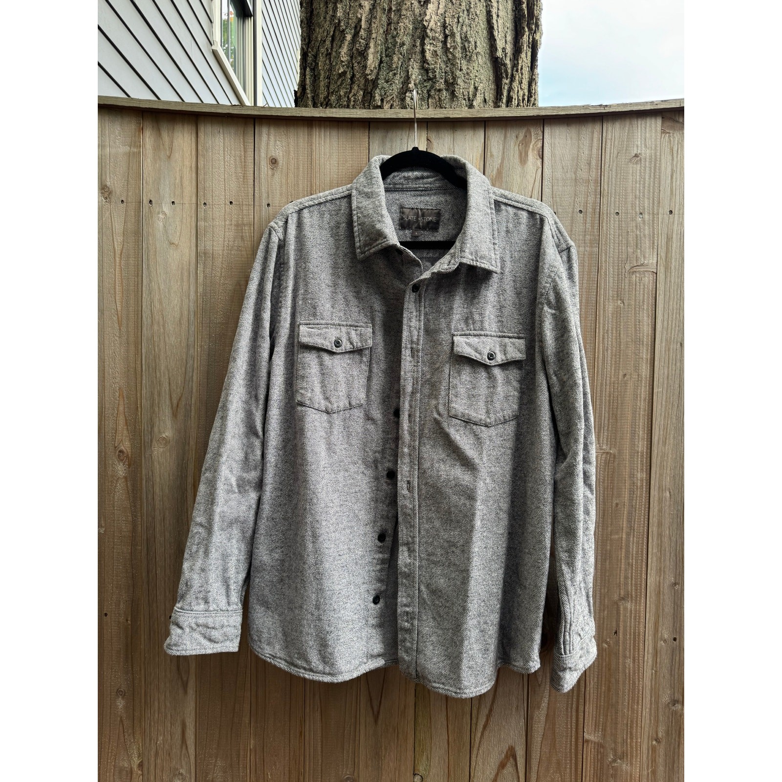 Men Slate & Stone Cotton Flannel Shirt Shacket in Grey Twill size L Quiet Luxury Update your wardrobe with this stylish shirt-jacket crafted from comfortable cotton. Spread collar Long sleeves with button cuffs Raised placket Chest patch pockets Curved hem Materials/Fabric: 100% cotton Measurements: pit to pit: 23" length: 27" sleeve length inseam: 19"