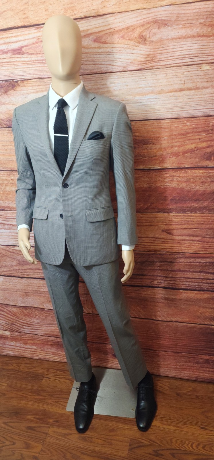 This Men's JoS.A.Bank Classic Collection 38R 32W Suit is a stylish and sophisticated choice for business occasions. Made from 100% wool with a houndstooth pattern, this two-piece suit features a classic notch lapel and four-button sleeve detail. The suit has a regular length jacket with a straight leg style and double-vented back for added comfort and flexibility. With a timeless flat front design and inner pockets, this suit is a versatile option for any season or event. Made in the United States by Jos. A. Bank, this suit exudes quality and craftsmanship. ADDITIONAL MEASUREMENTS: Shoulder to shoulder: 18 inches Shoulder to sleeve: 24 inches Pit to pit: 21 inches Suit length: 29 inches Leg length: 42 inches Inseam: 32 inches Waist: 32 Ankel width: 8.5 inches Extra fabric hemmed: 2.5 inches