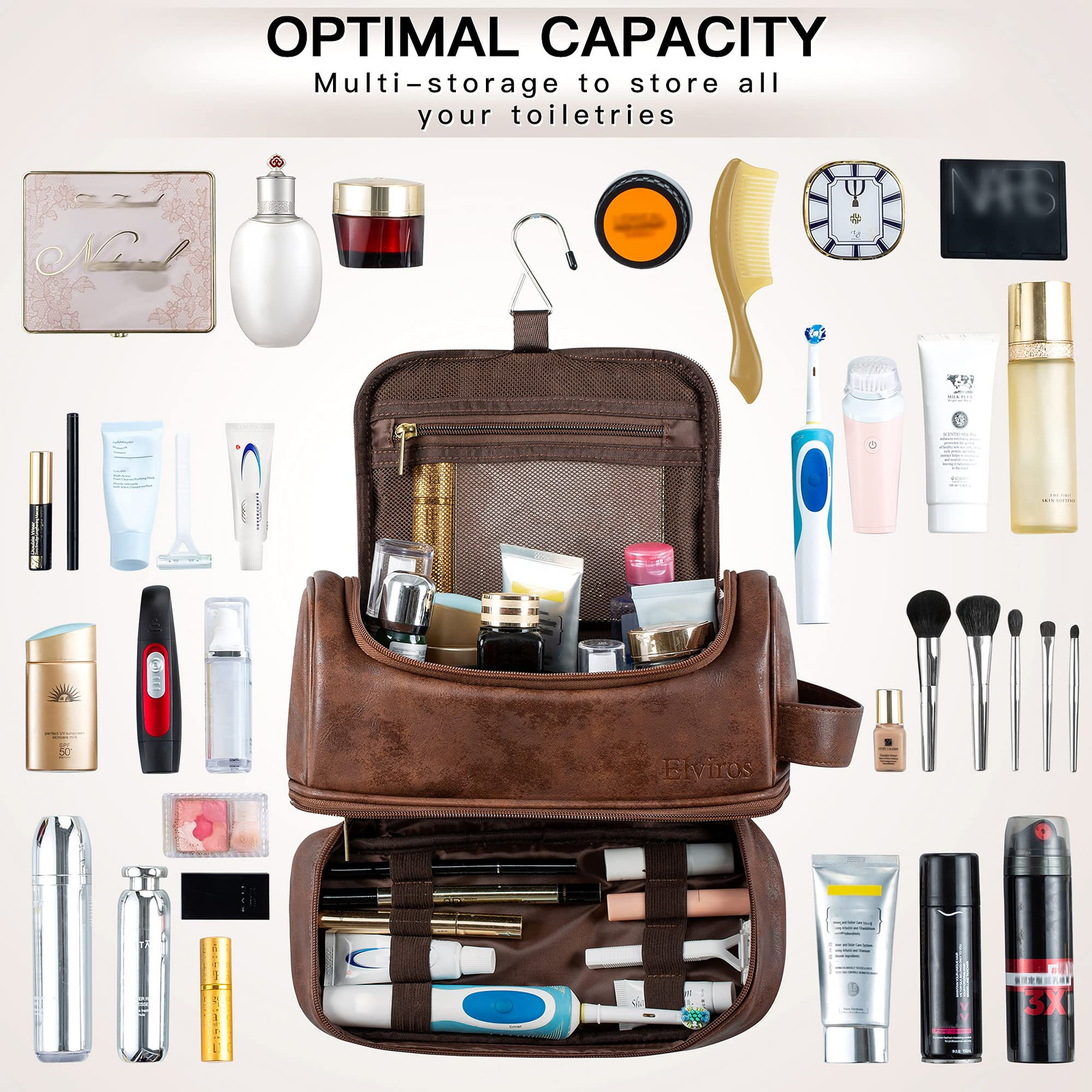WATER RESISTANCE STURDY MATERIAL:Exceptionally well built, the toiletry bag is made of PU leather, water-resistant nylon lining to keep moisture out of the bag. Premium zipper and reinforced seams are also implemented for long-lasting performance WATERPROOF SHOES BAG: Comes with a waterproof bundle pocket for storing your shoes, dirty clothes, etc. Made from 100% waterproof fabric to ensure everything stays dry! UPGRADE LARGE CAPACITY - 2 separate compartments and multiple pockets inside, Dimension: 12" x 4.7" x 7.1"/ 30.5cm*12cm*18cm (L*W*H), which can contain most of your toiletry travel essentials orderly in the bag like toothbrushes, deodorants, travel-size shampoos, toothpaste, makeup, and shaving cream, etc. LARGE OPENING CONVENIENT STORAGE & CARRY: Side leather handle, easy to carry. Large zipper opening at the top, easy access to toiletries. Stow-away swivel non-slip metal hook for versatile hanging options. MULTIPLE USE & SUITABLE FOR TRAVEL: This versatile hanging toiletry bag can also be used as a men's or women's shower bag, bath organizer, Dopp kit, or shaving bag. This makes it an excellent travel essential for business trips, vacations, gym, camping, home use, and more.