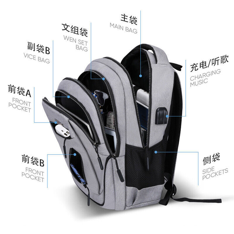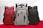 1. Item: Backpack 2. Color: Gray, dark gray, black, red 3. Material: High density water-proof polyester 4. Lining: polyester 5. Dimension: Large Size (20inch): 50*35*19cm, can fit 17.3inch laptop Small Size (18inch): 47*33*17cm, can fit 15.6inch laptop Features: 1. FABRIC- Water-repellent Polyester material 2. Waterproof material: splash and scratch resistance 3. Large capacity 30L: Store items for 5~7 days business trip 4. Ergonomic design: thick and breathable sponge, S-shape strap make your back more comfortable 5. Hidden anti-theft pocket is designed on the back of the backpack. 6. Earphone jack and Faster charging USB port 7. Inside item slots and Luggage belt 8. Multi-site reinforcement, shoulder strap bearing 20kgs.
