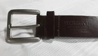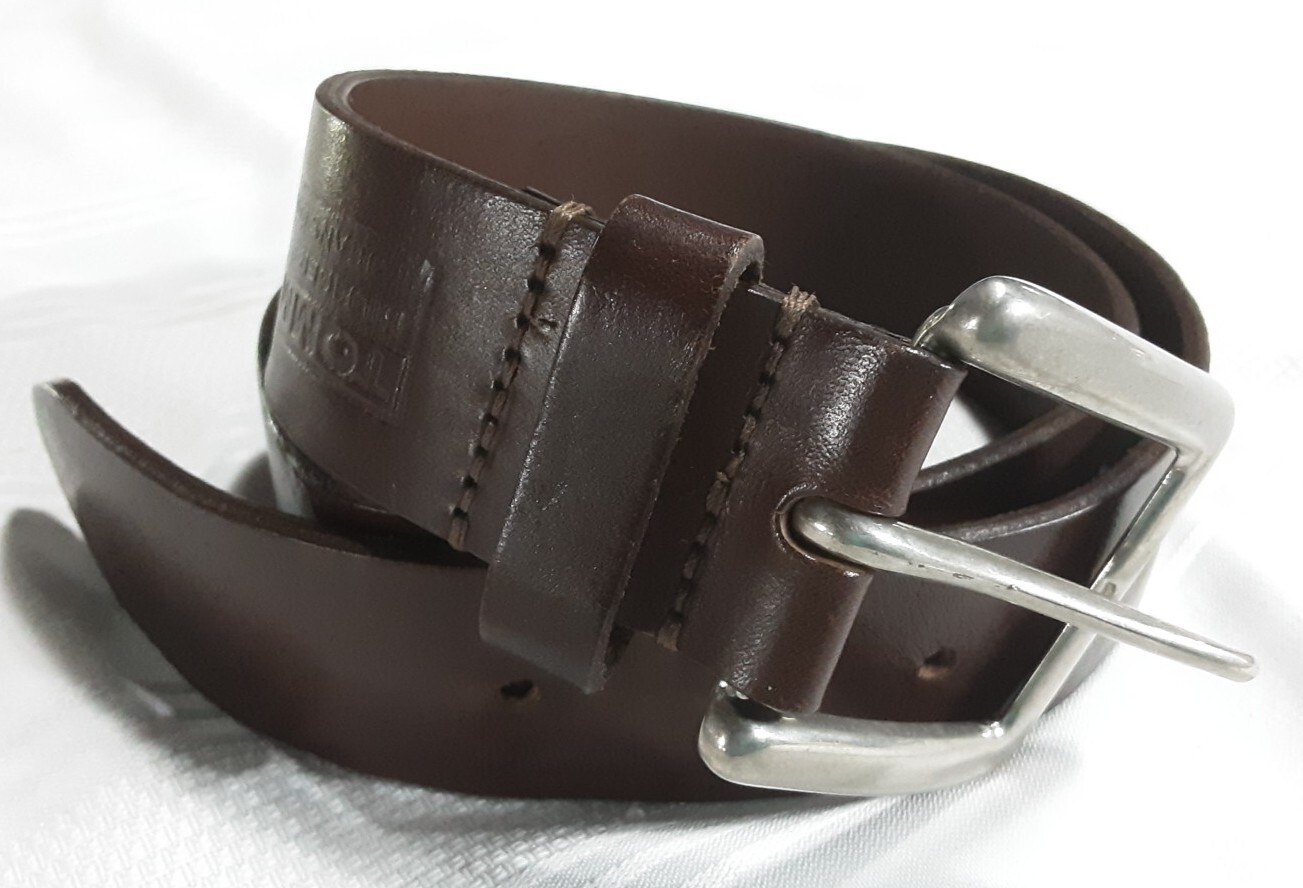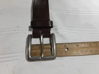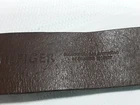 TOMMY HILFIGER WIDE 1.5" POLISHED LIKE FINISH BROWN BELT SIZE 34". SILVER TONE, GUNMETAL SQUARE SHAPE 2.25" X 2.25" TOTAL LENGHT 37" 5 HOLES 30", 31", 32", 33", 34". HAS A BELT STAY. VERY GOOD CONDITION. A LITTLE INPRESS MARKING OF WHERE THE BELT WAS. SEE PICTURE. DK46