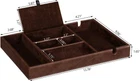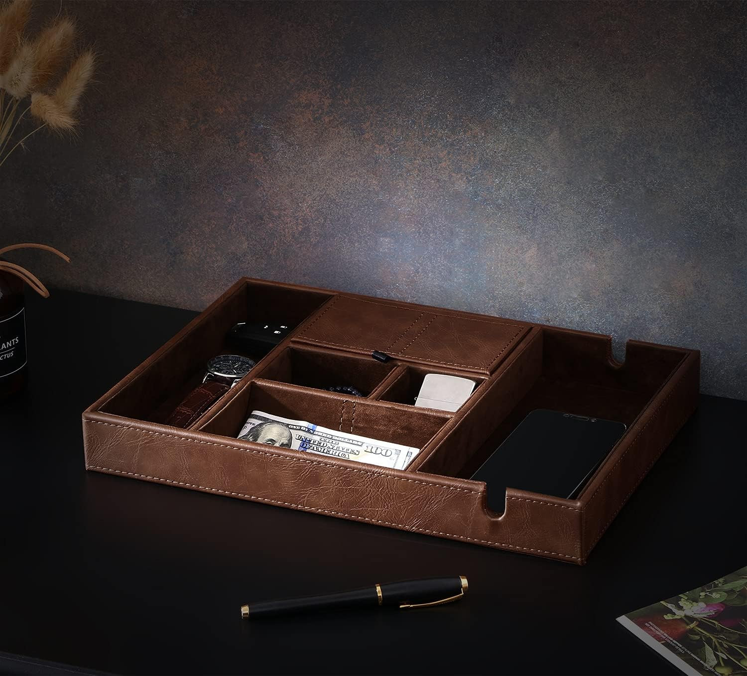 UNIQUE DESIGN: The valet tray offers 6 sections to hold stuff, each compartment is different. Sturdy top lid offers you a privacy space to store valuables safe from dust and scratch. The edc tray has a large smartphone charging station, you can charge your phone in the area without awkwardly bending the charge cord. Four more compartments of various sizes are useful to store other men's accessories