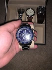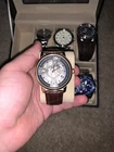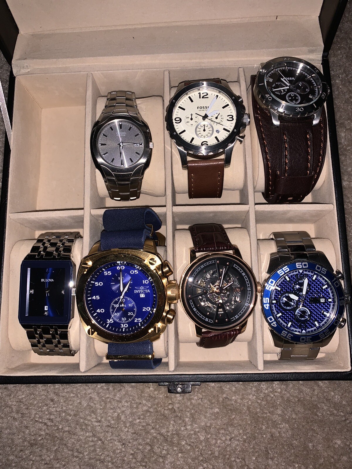 Selling this watch lot as a packet, box not included. Some of the watches have the original box and they all fit a wrist size 6.5inch. All watches need a battery replacement. Citizen Eco Drive, steel bracelet Fossil brown leather bracelet Fossil black leather bracelet - never worn, pristine. Bulova Diamond blue dial, steel bracelet Invicta aviator, huge watch face Reign automatic - bonus watch, may need servicing Invicta Trinite glow, blue dial For more details message me. Sold AS IS, NO REFUNDS. Buyer pays for shipping!