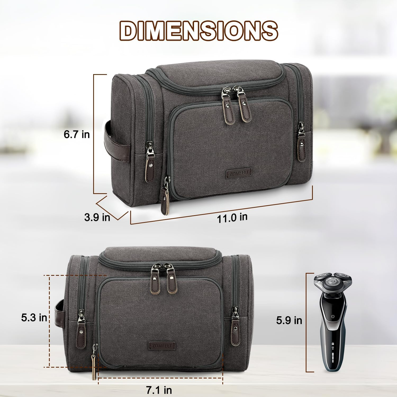 SPACIOUS AND ORGANIZED DESIGN: Measuring 11.0×3.9×6.7 inches, this toiletry bag features elastic retention bands in the main compartment to securely hold bottles upright. The 180° lay-flat front pocket offers quick access. The travel toiletry bag is perfect for tooth brushes, facial cleansers, travel shampoos, razors, electric shavers, and other toiletries and travel essentials WATER-RESISTANT CANVAS MATERIAL: Made of quality lightweight water-repellent canvas, this dopp kit combines practicality with style.The side leather handle ensures comfortable carrying or hanging. Easy to clean fabric maintains its stylish appearance trip after trip SEPARATE WET POCKET : Mens toiletry travel bag comes with separate wet pocket and regular side pocket.This separate wet pocket with waterproof PVC lining allow you to keep dry travel toiletries from shower/wet toiletry items, regular side zipper pocket, and the regular side pocket can store bathroom small items COMPACT AND PRACTICAL: Perfect for travel or home use, this compact yet spacious toiletry bag fits neatly in suitcases for business trips, vacations, or beach getaways.The toiletries travel bag works equally well on your bathroom counter or dressing table PERFECT GIFT: ZOMFELT travel toiletry bag combines a toiletry bag, shaving kit, and makeup/cosmetic bag into one convenient solution. The perfect practical gift for fathers, husband, friends, graduates, or travelers Product description
