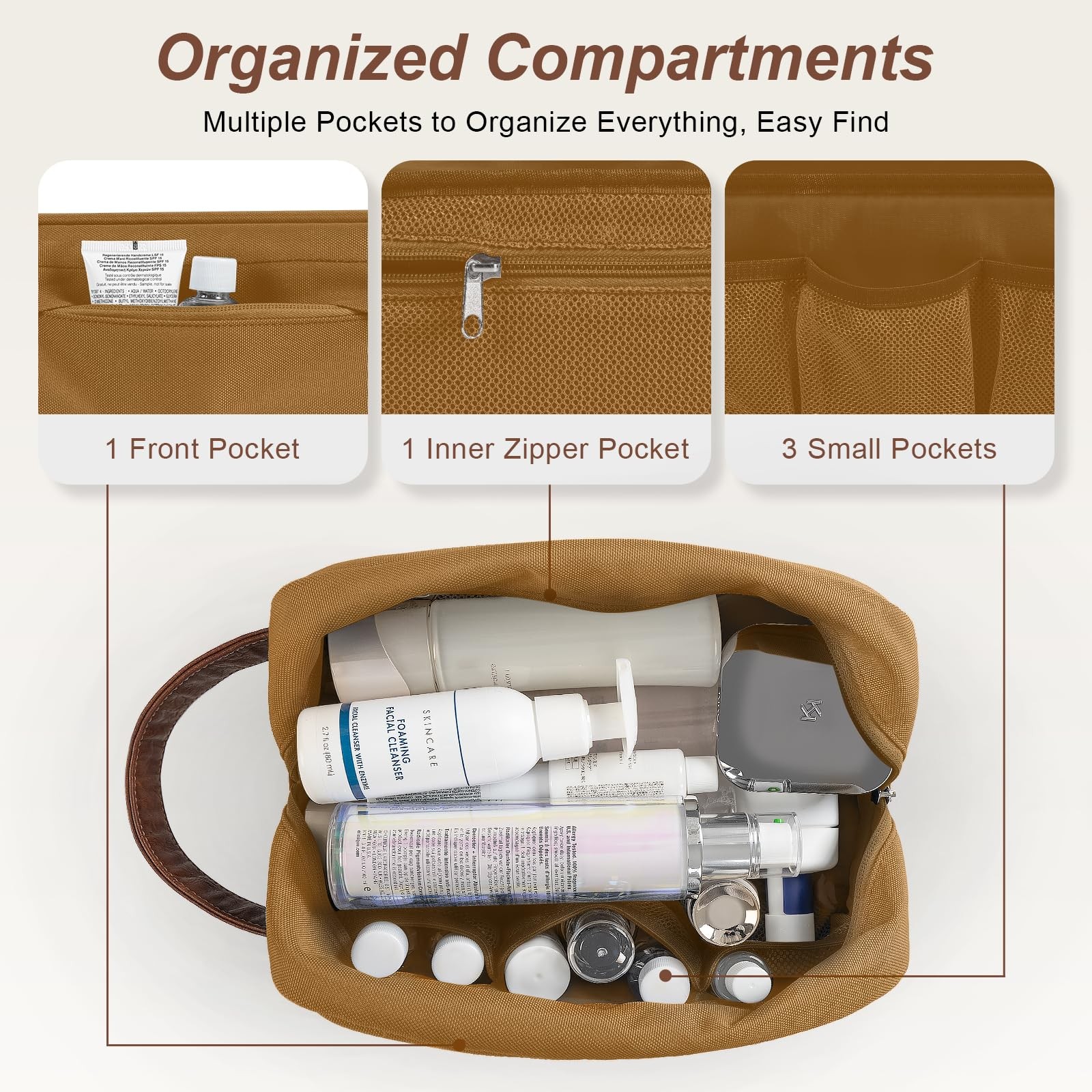 Ezday Travel Toiletry Bag for Men has great value, light weight, high quality and perfect size for all their essentials. It's easy for traveling, great for your guy on the go and that the materials are fine. The multiple pockets that allow them to organize everything. It's well-made, nice-looking, and offers both style and functionality. Premium material: The travel toiletry bag is made of water-resistant sturdy & wearable quality polyester and PU leather material that has no unpleasant smell. These make the bag itself very well-constructed to keep the shape, durable, easy to wipe clean and protect your toiletries from splashed water Large capacity: Size 10 x 5 x 5.5 inches. 1 main compartment which is roomy to fit facial cleanser, electric shaver, travel shampoo, and other toiletries. 3 small mesh pockets and 1 long mesh pocket with a zipper inside to store all of your little toiletries without getting disorganized and easy to find. 1 front zipper pocket that provides extra storage with ease Portable design: Leather handle makes the Dopp kit for toiletries easier to carry and hang, reinforced bottom with leather makes it wearable. The combination of zipper & zipper ear makes it easier to hold and zip up and down. This toiletry bag is in a perfect size that can be packed up and tucked away in the suitcase Multipurpose for usage: This Dopp kit is suitable for both home and travel. It's big enough to fit bathroom supplies and easier to grab things during the trip. If you want to store other small items and makeup, it can be a great storage pack or cosmetic organizer, this bag is all the rage for storage of toiletries in the bathroom, dressing table Well-designed for gifts: The shaving bag is classic and stylish, we offer different colors for everyone to choose from. As a gift for husband and friends, it has nice color, size, and quality feel, even using for a long time it remains attractive and stands up well.