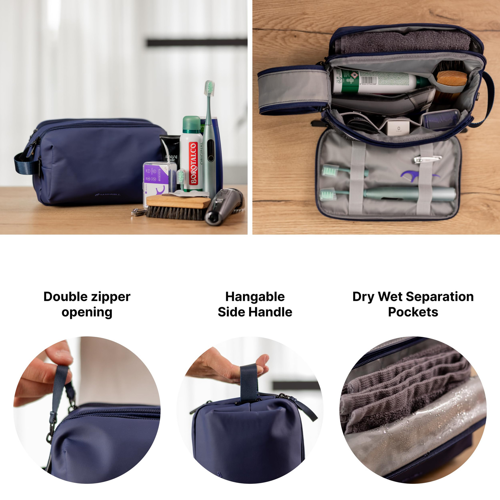 Perfect for All Occasions : Our men's toiletry bags are a must-have for weekend trips, airplane travel, camping and more. This versatile toiletry bag is your go-to accessory, keeping all your hygiene and personal care items in order, making packing and unpacking a breeze. Versatile and Spacious : {10.6in x 3.9in x 6.7in} This large toiletry travel bag for men accommodates all your grooming essentials, from your shaving kit to shower accessories. Multiple compartments keep your items organized for hassle-free travel. Just pack it in your backpack, gym bag or suitcase for optimal organization. Durable and Water-Resistant : Crafted to withstand rigorous travel conditions, our men's toiletry bag boasts a water resistant material that's easy to wipe clean, safeguarding your luggage from any unexpected spills or wet environments. Travel Friendly Design : Our dopp kit features a double-zippered opening for easy access, a separate water-proof compartment and elastic straps to hold your bottles upright, catering to all your vacation, travel and on-the-go needs. This toiletry bag is hangable and portable for extra convenience. American Owned : Our mission is to help reduce American dependence on China. is 100% American owned and headquartered in Miami, FL USA. We do not produce any items in China and our men's shaving kits are 100% made in Myanmar.