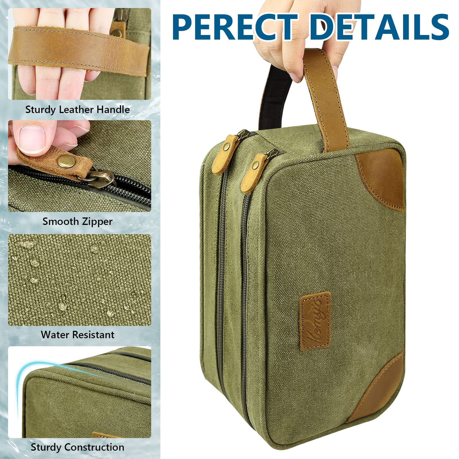 Canvas, Genuine Leather Imported Zipper closure 【Premium Toiletry Bag】The toiletry bag for man is made of premium genuine leather and waxed canvas with reinforced seams to keep its shape and protect your toiletries from splashes. Classic retro and multi-color style, provide you with a variety of options for organizing your toiletries! 【Multipurpose 】This travel toiletry bag is specially designed for travelers, it can be used as a toiletry bag, cosmetic bag, shaving kit, and can more toiletries and cosmetics. This men's dopp kit is practical in appearance, lightweight and versatile, it is the best choice for travel, vacation, gym! 【Large Capacity Dopp Kit for Men】The mens toiletry bag has roomy two compartments for all your essentials, and the smaller interior tiers are compact enough for efficient packing, keeping your toiletries/shaving supplies organized! This is the best gift for your husband, boyfriend and friends. 【Portable Shaving Bag】The sturdy genuine leather handle makes the mens travel bag toiletry easier to carry without adding an extra burden to your luggage. The compact travel toiletry bag for men fits easily into suitcases and bags, and can also be folded into a flat shape to save space, making sure to carry your toiletries bag easily when traveling, camping! 【Toiletry Accessories for Travel】toiletry bags is durable and easy to clean. Dimensions: 10 x 5.9 x 4.9 in. Our toiletry travel bag have undergone strict quality inspection, if you have any questions during use, please feel free to us.