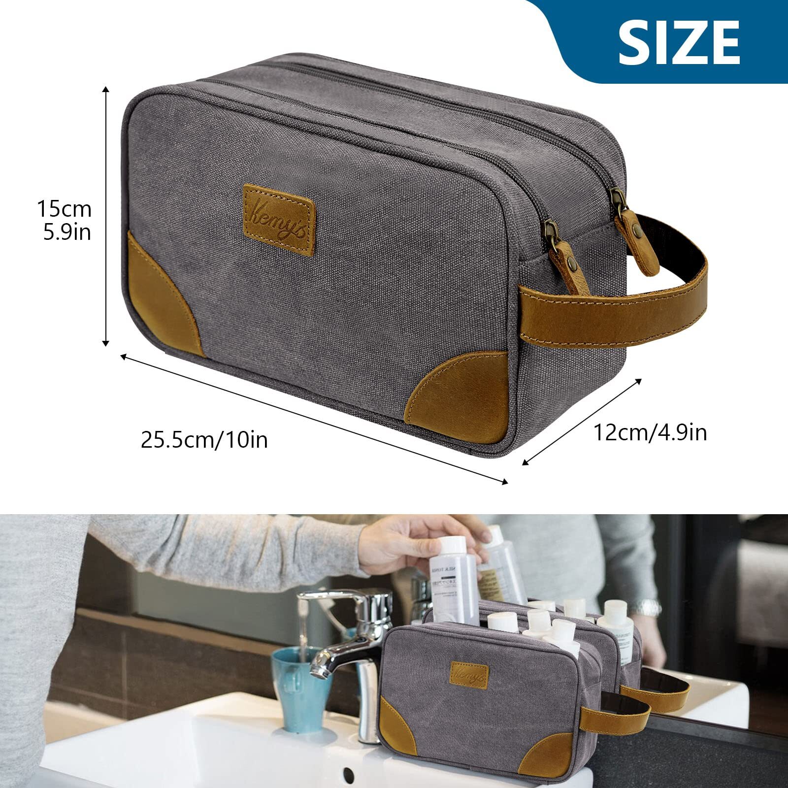 This toiletry bag is a game-changer for travel! The water-resistant canvas and genuine leather keep everything dry, and the sturdy zipper ensures nothing spills. Perfect size for all my essentials—shaving gear, toiletries, even small bottles. The retro design looks sharp, and the reinforced seams make it durable. Fits easily in my luggage but stands out as a stylish dopp kit. Highly recommend for any guy who wants to stay organized on the go!