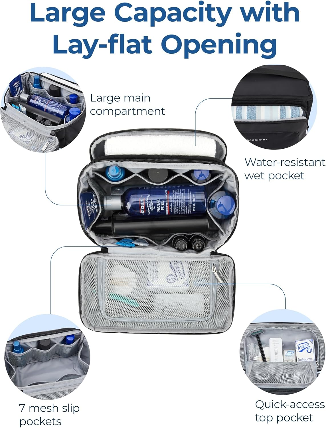 ๐๐ฅ๐๐ ๐๐ง๐ญ ๐๐ ๐๐๐๐ญ๐ก๐๐ซ ๐๐๐๐๐ง๐ญ๐ฌ๏ผMens Toiletry bag features PU leather trims and water-resistant polyester for elegance and functionality. ๐๐ง๐ข๐ช๐ฎ๐ ๐๐๐ฒ-๐๐ฅ๐๐ญ ๐๐๐ฌ๐ข๐ ๐ง๏ผMens toiletry travel bag wide lay-flat opening offers convenient and easy access to toiletries. ๐๐ฎ๐ฅ๐ญ๐ข-๐ ๐ฎ๐ง๐๐ญ๐ข๐จ๐ง ๐๐จ๐๐ค๐๐ญ๐ฌ๏ผMens travel bag toiletry features a water-resistant wet pocket, 7 mesh slip pockets and quick-access top pocket to organize various travel items. ๐๐ก๐จ๐ฎ๐ ๐ก๐ญ๐๐ฎ๐ฅ ๐ ๐๐๐ญ๐ฎ๐ซ๐๐ฌ๏ผThe Dopp Kit features a sturdy carry handle and smooth two-way zippers. Designed for ease and durability, it's easy to carry on the go. ๐๐ซ๐๐ฏ๐๐ฅ ๐๐๐๐๐ฌ๐ฌ๐จ๐ซ๐ข๐๐ฌ๏ผBagsmart travel toiletry bag can be used as cosmetic bag, grocery bag, toy bag, medicine bag, skincare bag, electronics bag, stationery bag, storage bag etc. Product Description The video showcases the product in use. The video guides you through product setup. The video compares multiple products. The video shows the product being unpacked. toiletry bag Merchant Video