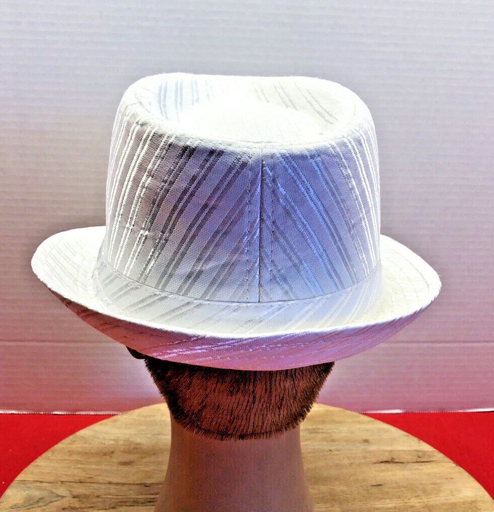 Very nice vintage Milani fedora in bright white polyester blend with silver accent stripes. Very beautiful and well cared for. Has initials on inside sweat band. Size S/M. Please see pictures for details.