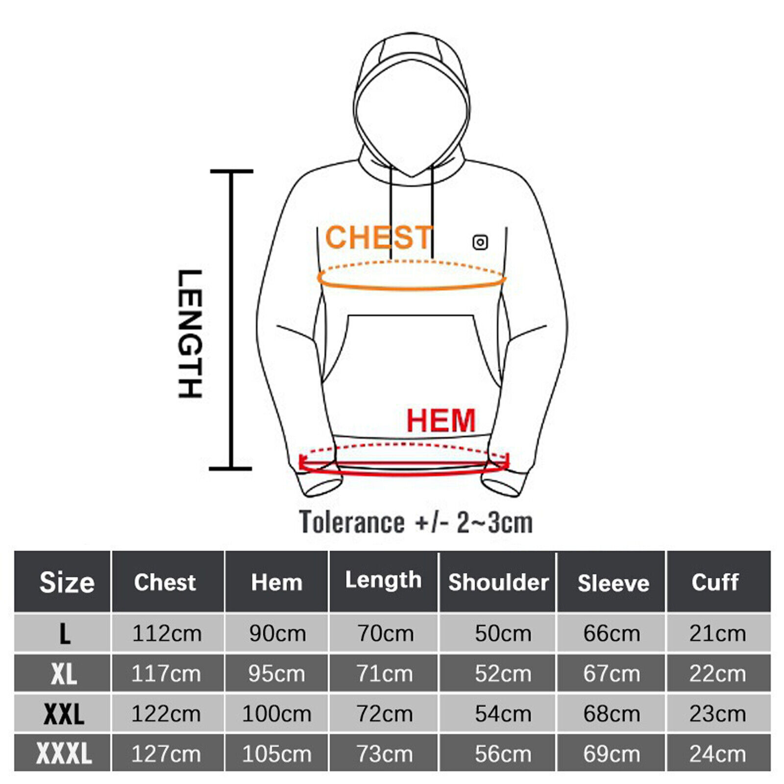 Details Size: L 1, Battery not included 2, We are Asian size, 2-3 sizes smaller than European size, please choose the right size according to our size chart。 3, Recommend batteries model, please use batteries with high USB Power Delivery(unit:W), The higher the USB Power Delivery, the higher the heating temperature.(output Power (W)=Voltage (V) × Current (A).) for example :output power 10W=5V*2A / output power 22.5W=5V*4.5A Package Includes: 1x Hoodies Shipping Policy We only ship to confirmed ebay address. Ship From outside USA Economy Shipping, with no tracking number. Standard Shipping, with tracking number. Express (Expedited) Shipping, with tracking number. Economy shipping needs 11-35 business days to arrive mostly. Standard Shipping needs 7-19 business days to arrive mostly. It depends on your location and local postal service, as well as the weather condition along the shipping. 4)If you need a faster delivery time, you could choose Express (Expedited) Shipping. You may need to pay for the extra shipping cost. Please contact us if you need. Ship From USA We ship within 3 business day of payment; The item will be shipped from our US Warehouse via Standard Shipping (usually 1-5 business days to deliver) or FedEx Ground or FedEx Home Delivery (usually 1-5 business days to deliver) with tracking information, depending on shipping location. Please feel free to contact us if you don't receive the package within one week. We will help you to solve the problem, thanks. Payment Method We accept Payoneer only. Please pay attention that import duties, taxes and charges are not included in the item price or shipping charges. These charges are the buyer's responsibility. Please check with your country's customs office to determine what these additional costs will be prior to bidding/buying. Returns Policy We offer 30 day money back or replacement guarantee. In addition, it allows customers to return new and unused products in their original factory condition for any reason within 30 days from the date of purchase. Although we test each item and they are packed professionally, few item(less than 0.1%) might be damaged during the shipping. Please feel free to contact us within 5 days after you receive your package about replacement. If you don't receive items over 35days ,please make sure to contact us before leaving any neutral or negative feedback.We'll try our best to help you solve the problem. If we authorized the return, customers will get an email with instructions for returning the item. Email will be replied within 24 hours on Chinese business hours.