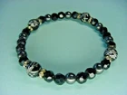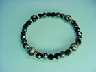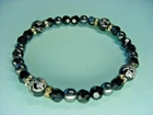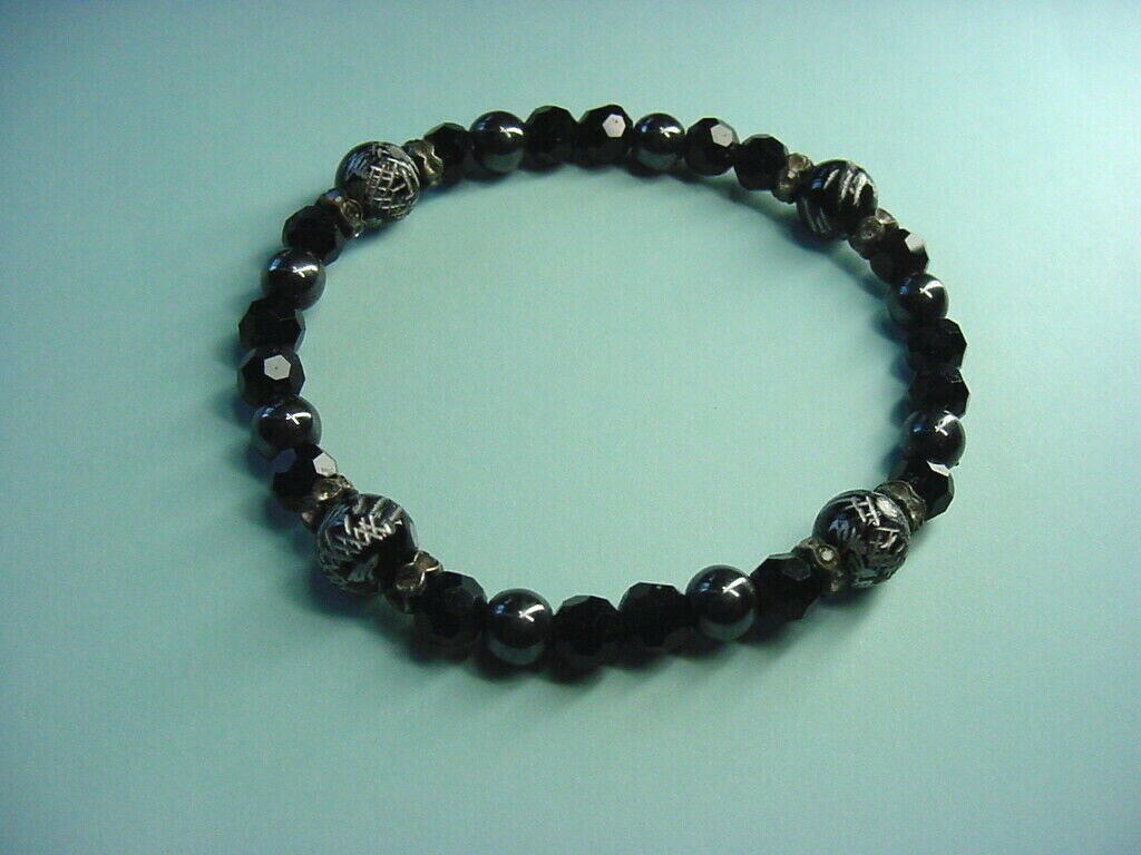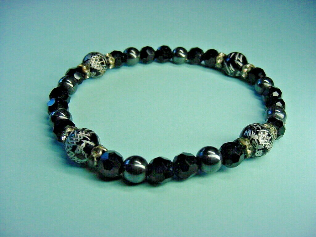 Bracelet - Black Beads - Smooth, Faceted, & Etched - For Men Or Women - Crystal Spacers - Stretchy Cord Etched Beads are about 0.3" in diameter Bracelet is about 6-3/4" long around